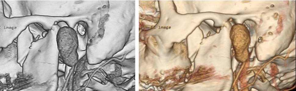 Ryc. 2. Angiografia tomografii komputerowej – widoczny tętniak rzekomy, złamanie wyrostka kłykciowego i dziobiastego żuchwy po stronie lewej.