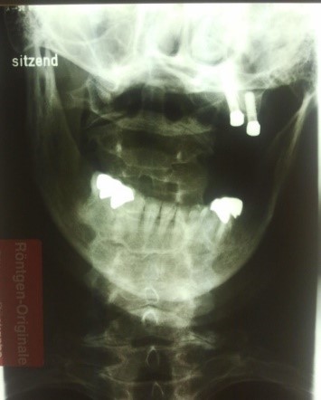 Ryc.5.Zmiany strukturalne stawu szczytowo-obrotowego lewego u kobiety 54-letniej widziane na zdjęciu rentgenowskim.
