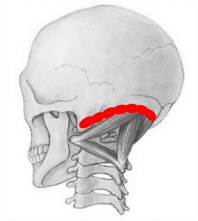 Ryc.6.Przyczepy mięśni podpotylicznych, czerwoną linią zaznaczono miejsca wykonania mobilizacji uciskowych.
