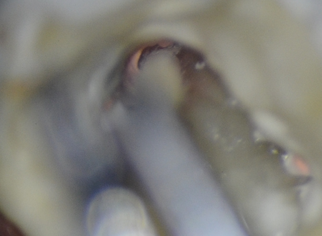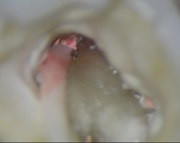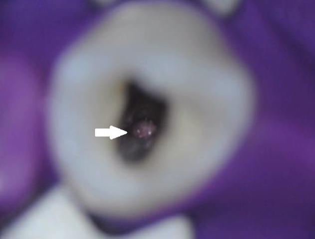 Ryc. 3. Złamane narzędzie tkwiące w obrębie części koronowej kanału. Strzałka wskazuje widoczny w ujściu koronowy koniec złamanego fragmentu.