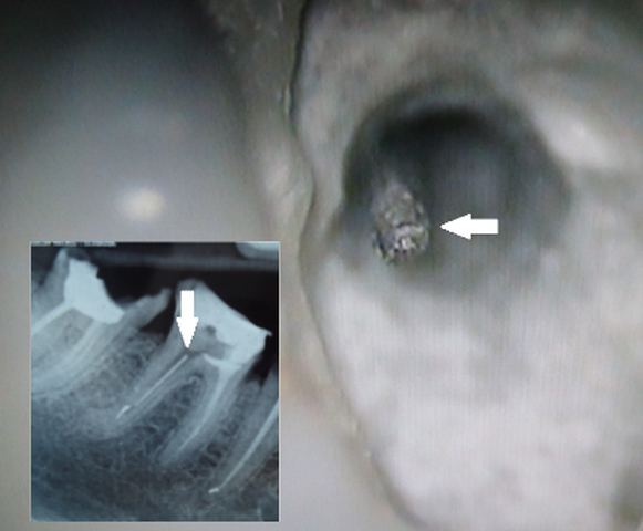 Ryc. 4. Fragment narzędzia tkwiący w kanale policzkowym zęba przedtrzonowego szczęki. Strzałka wskazuje kornowy koniec złamanego fragmentu.