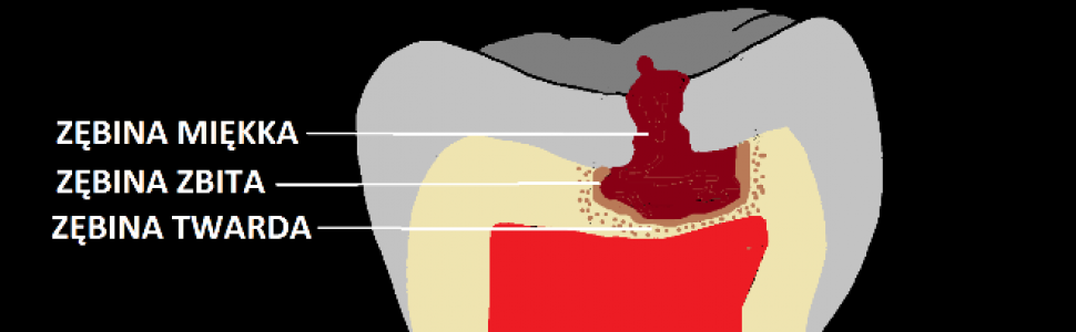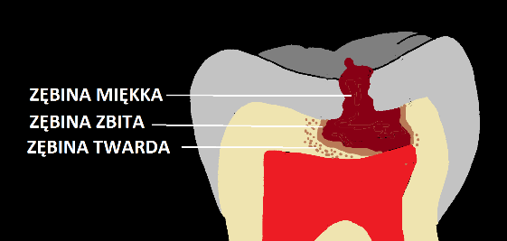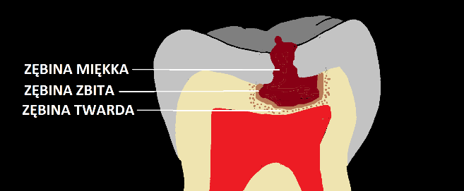 Ryc. 4. W przypadku próchnicy bardzo głębokiej po usunięciu próchnicy ze ścian ubytku można pozostawić na jego dnie miękką zębinę przykrywając ją materiałem bioaktywnym. Wkroczenie do ubytku ma miejsce po 6-12 miesiącach i najczęściej związane jest z tzw. „doczyszczeniem” dna ubytku.