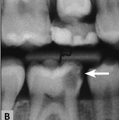 Ryc. 2. Próchnica bardzo głęboka. A. Schemat, B. Zdjęcie rentgenowskie