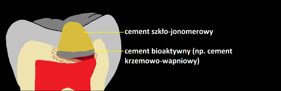 Ryc. 3. W przypadku próchnicy głębokiej po opracowaniu selektywnym dna ubytku do zębiny zbitej należy przykryć je materiałem bioaktywnym, a następnie po ew. założeniu podkładu ostatecznie wypełnić.