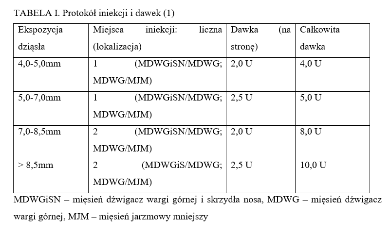 Aktualny protokół iniekcji i dawek w nakładających się obszarach działania mięśni zaproponowany przez Polo zaprezentowany w tabeli I zakłada maksymalną dawkę 10 jednostek w leczeniu zaawansowanego uśmiechu dziąsłowego (1). W prezentowanym artykule dawka została podwojona z uwagi na brak zadowalającego efektu.