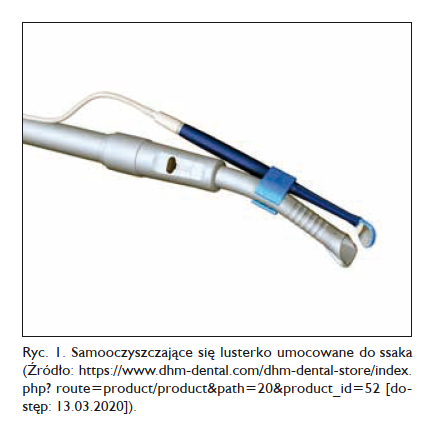 Lepszym rozwiązaniem wydają się systemy lusterek, w których jest zapewniony nadmuch powietrza na zwierciadło (na przykład samooczyszczające się lusterko Yirro+) (ryc. 1). W tym konkretnym systemie krople wody i inne zanieczyszczenia są zdmuchiwane przez powietrze dostarczane odpowiednim przewodem. Urządzenie można łatwo zamontować do każdego unitu stomatologicznego i bezproblemowo włączać i wyłączać nadmuch, a także regulować siłę strumienia powietrza, co okazuje się konieczne w przypadku niektórych procedur. W przypadku pracy bez asysty lusterko montuje się do końcówki ssaka (1, 2). W tym miejscu należy stwierdzić, że prezentowane rozwiązanie wydaje się godne polecenia w sytuacji zagrożenia COVID-19 czy też innymi chorobami przenoszonymi drogą kropelkową, gdyż skraca czas pracy oraz zmniejsza ryzyko zakażenia lekarza, ograniczając w znacznym stopniu rozprzestrzenianie się aerozolu.