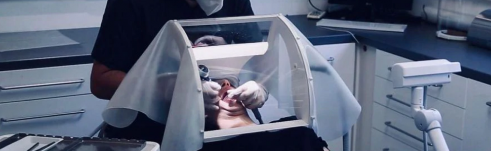 W tym miejscu warto wspomnieć, że w gabinetach stomatologicznych w przypadku zabiegów z wytwarzaniem aerozolu zaleca się stosowanie specjalnych urządzeń – ewakuatorów, które zasysają powietrze, oczyszczają z wirusów i bakterii dzięki wysokowydajnemu filtrowi powietrza, a następnie wydmuchują z powrotem do otoczenia. Alternatywnie, zassane powietrze może być kierowane do centralnego systemu usuwania powietrza. Aby dodatkowo zabezpieczyć operatora przed zakażeniem, zaleca się łączenie takich urządzeń na przykład z płytą wykonaną z przezroczystego poliwęglanu (płytę taką można zamontować do mikroskopu zabiegowego) (3, 4) lub nawet kabiną zwaną „bańką mydlaną”, zbliżoną wyglądem do komory wyciągowej używanej podczas pracy piaskarką poza jamą ustną (ryc. 2). Głowa pacjenta umieszczana jest w komorze, dzięki czemu lekarz pracując, nie ma kontaktu z powietrzem wydychanym przez pacjenta. Producent twierdzi, że stosując jego produkt można bezpiecznie wykonywać procedury stomatologiczne, podczas których generowany jest aerozol (5).