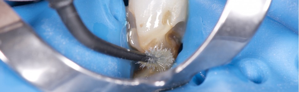 Ryc. 8. Selektywne wytrawianie szkliwa jako wstęp do aplikacji uniwersalnego systemu łączącego OptiBond Universal (Kerr).