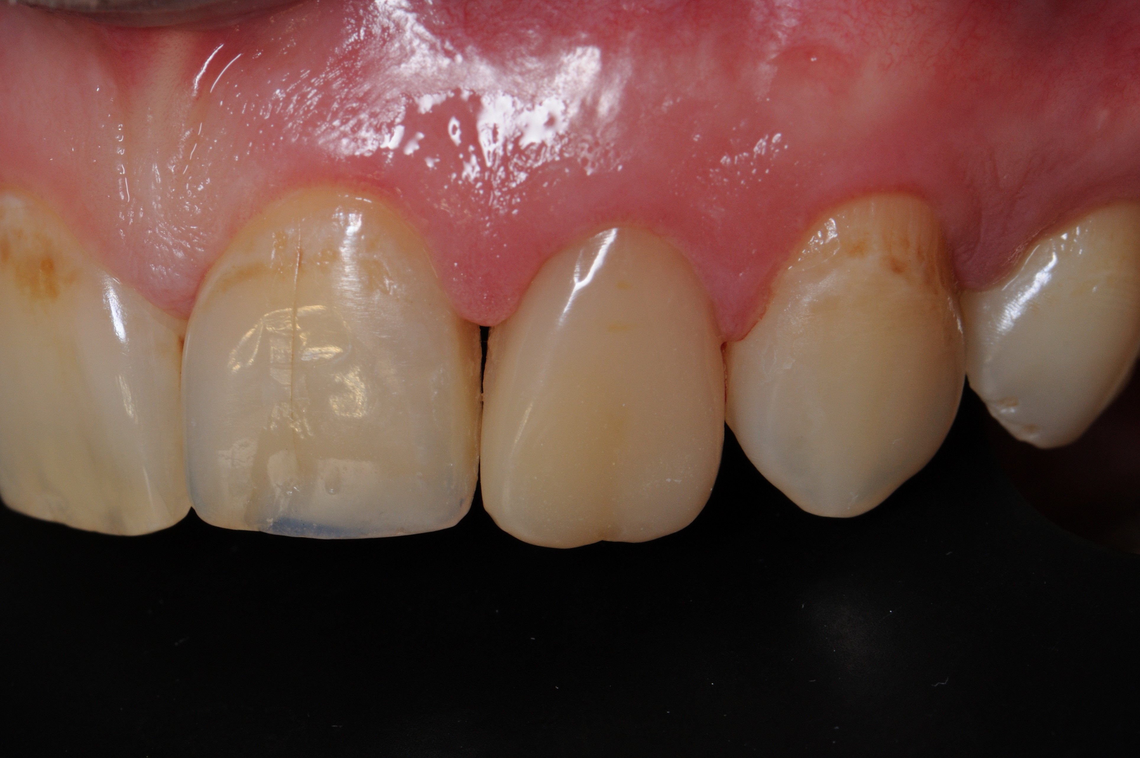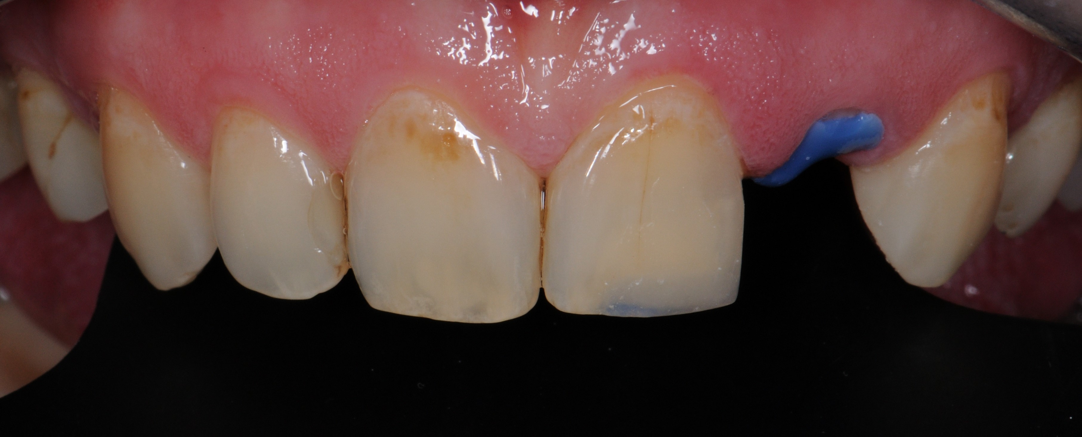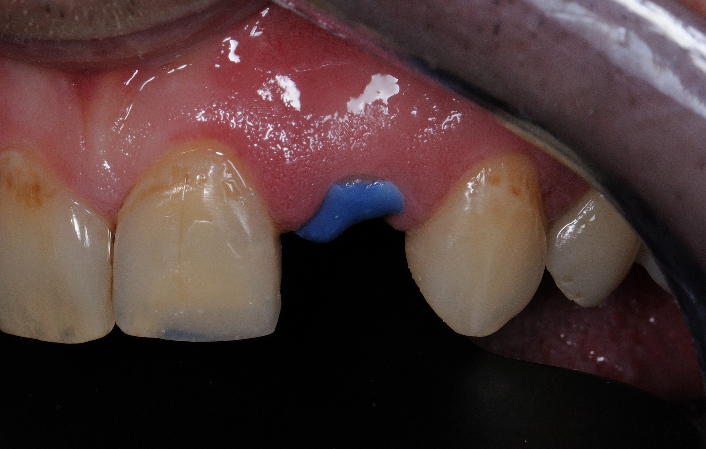 Ząb w przeszłości był prawidłowo leczony kanałowo. Zaraz po urazie pacjent zgłosił się do lekarza, który do czasu leczenia protetycznego zabezpieczył ujście kanału płynnym kompozytem w kolorze niebieskim (ryc. 2).