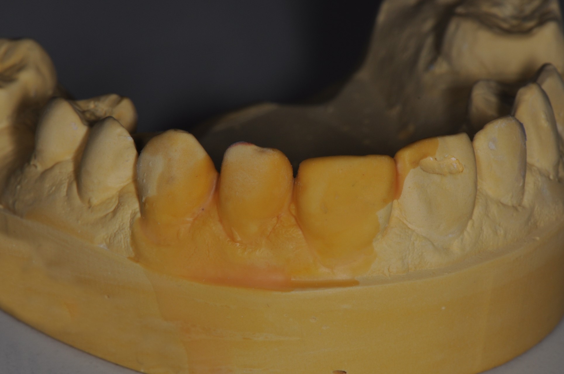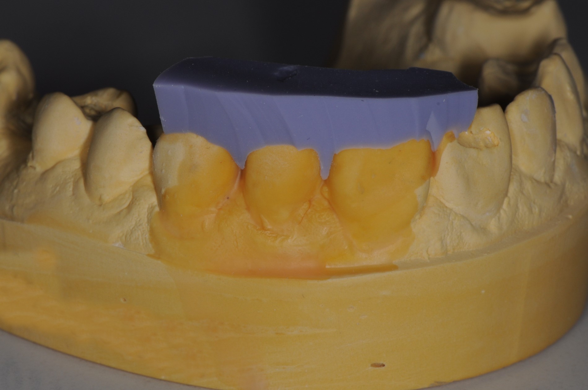 Na kolejnej wizycie omówiono z pacjentem możliwości leczenia i podjęto decyzję o wykonaniu bezpośredniej odbudowy na wkładzie z włókna szklanego, która w przyszłości będzie stanowiła bazę pod koronę protetyczną. Ponieważ ponad pół roku wcześniej została wykonana endokorona na ząb 36, w gabinecie znajdował się model szczęki pacjenta, sporządzony wówczas jako przeciwstawny (ryc. 3). Na tej podstawie możliwe było wykonanie indeksu silikonowego (ryc. 4) i dokładne odwzorowanie oryginalnego kształtu utraconej korony zęba.