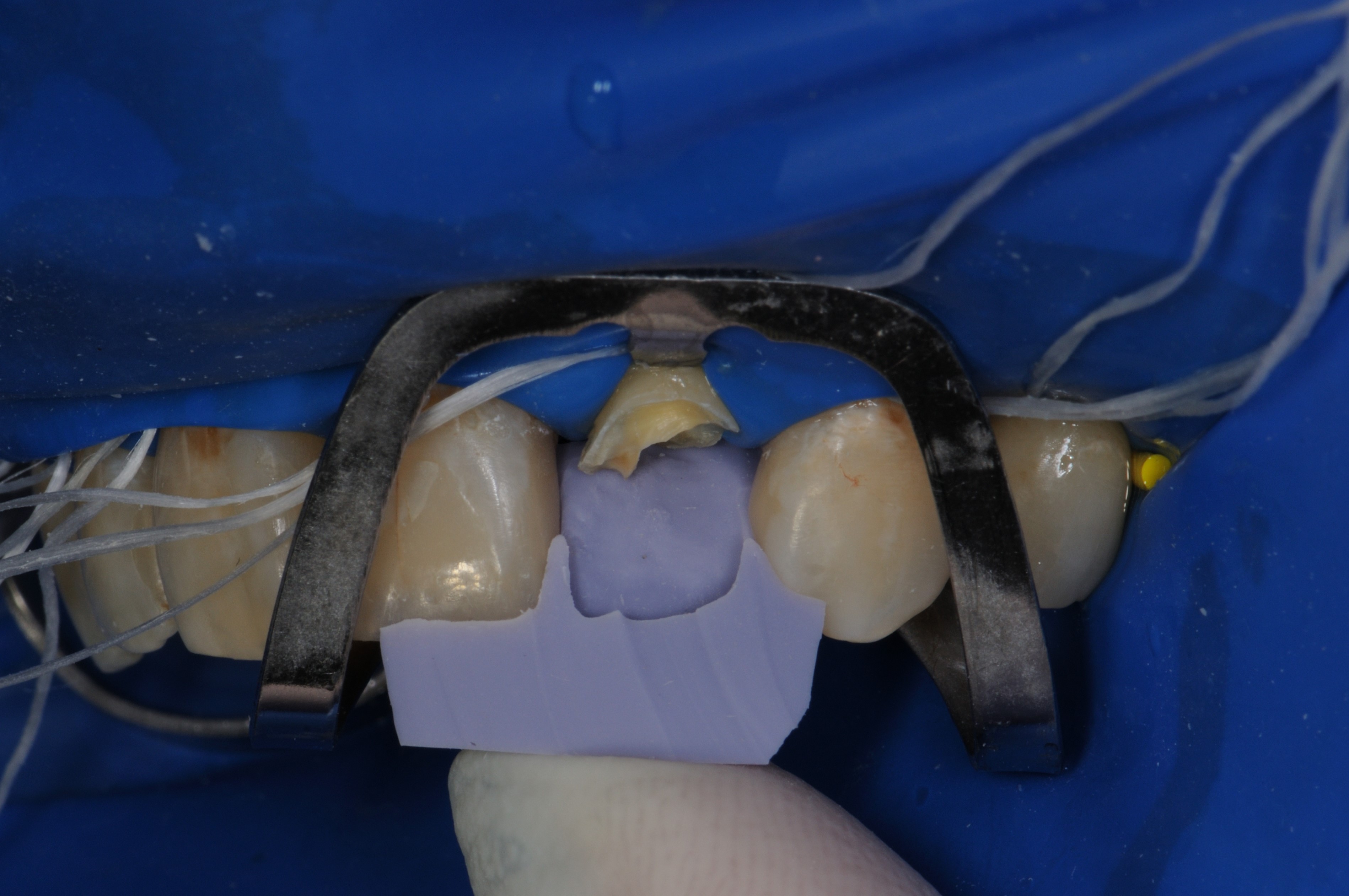 Usunięto opatrunek i opracowano ścianę nośną zęba 22. Dobrano kolor, przewidując pracę w technice warstwowej. Zęby od 14 do 24 zaizolowano koferdamem. Wykonano preparację w obrębie kanału korzeniowego. Zamocowano dodatkową klamrę #B5 na zębie 22. Następnie przymierzono docięty indeks silikonowy, tak by umożliwił odbudowę ściany podniebiennej oraz brzegu zęba siecznego na odpowiednią długość (ryc. 5).