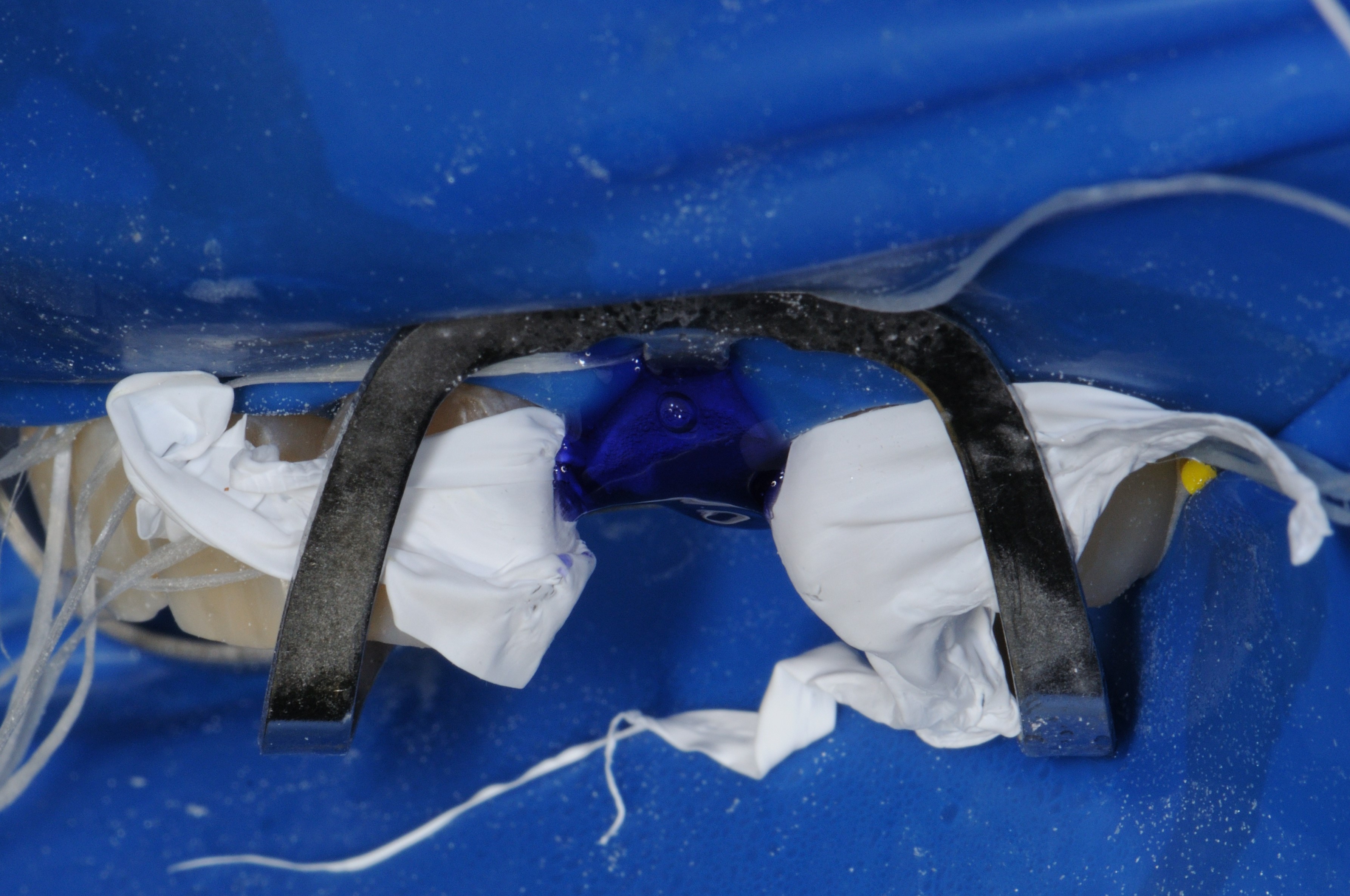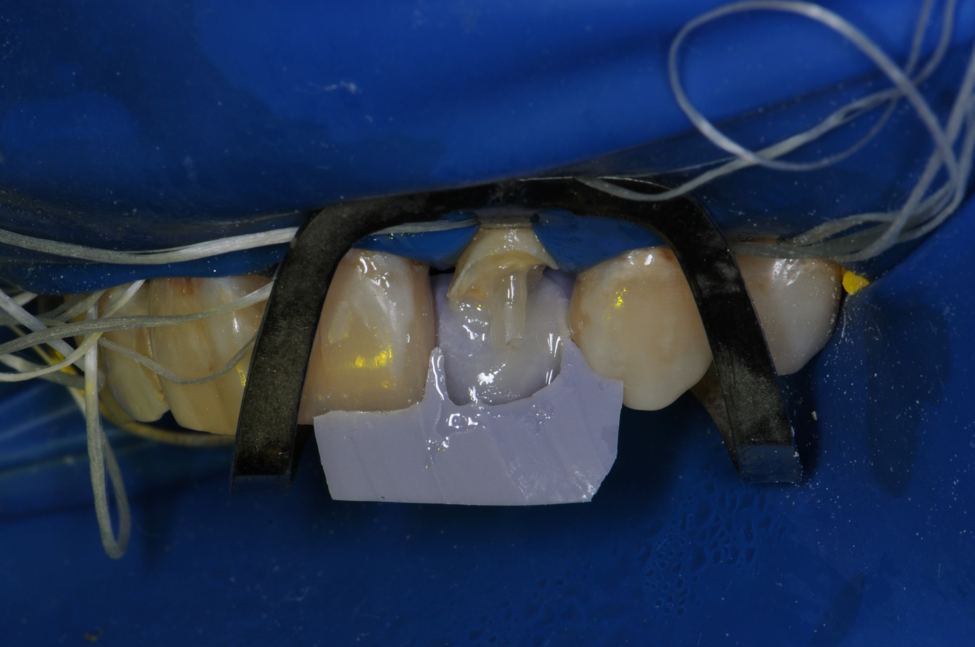 Przymierzono wkład koronowo­-korzeniowy z włókna szklanego, docinając go na odpowiednią długość, aby w trakcie odbudowy był całkowicie zabezpieczony materiałem kompozytowym. Zęby 23 i 21 zostały zabezpieczone paskiem metalowym, a 22 poddany piaskowaniu mikropiaskarką abrazyjną (MicroEtcher IIa, Danville) przy użyciu tlenku glinu o wielkości ziaren 50 μm. Następnie zęby sąsiednie zabezpieczono taśmą PTFE, a ząb 22 wytrawiono 36% kwasem fosforowym (Arkona) (ryc. 6).
