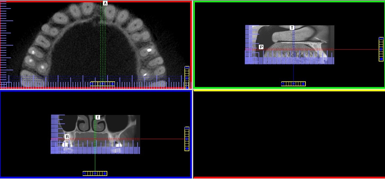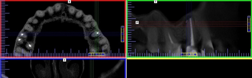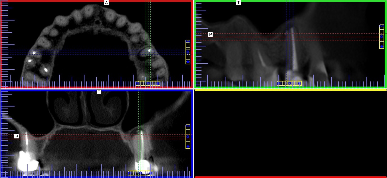 Ryc. 6. Tomogram szczęki. Widoczne „wirtualne” przekroje przez korzeń zęba 25 w trzech płaszczyznach, widoczne zmiany zapalne w tkankach okołowierzchołkowych i niewielka ilość uszczelniacza poza wierzchołkiem.