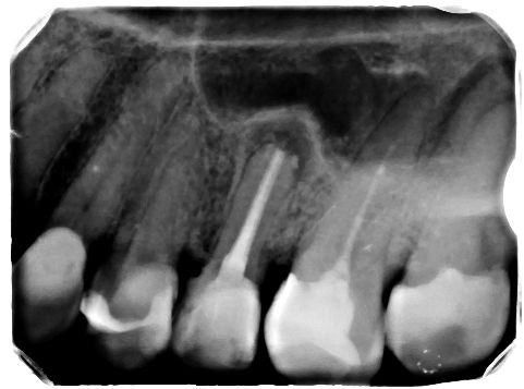 Ryc. 8. Zdjęcie rentgenowskie zęba 25 wykonane 2 lata po wykonaniu drugiego powtórnego leczenia kanałowego.