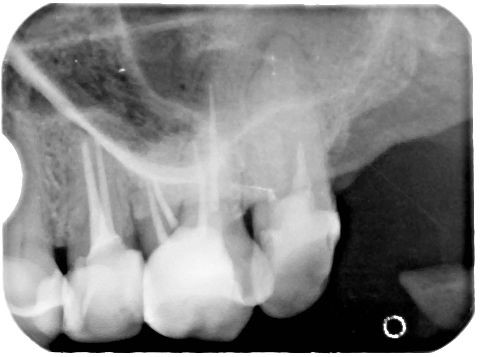 Ryc. 14. Zdjęcie rentgenowskie zęba 25 wykonane po wypełnieniu kanałów korzeniowych.