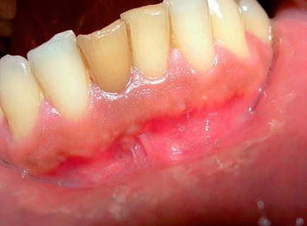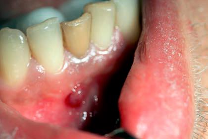 Ryc. 9. Przetoka czynna w przedsionku jamy ustnej, zlokalizowana w okolicy zębów 41-42.