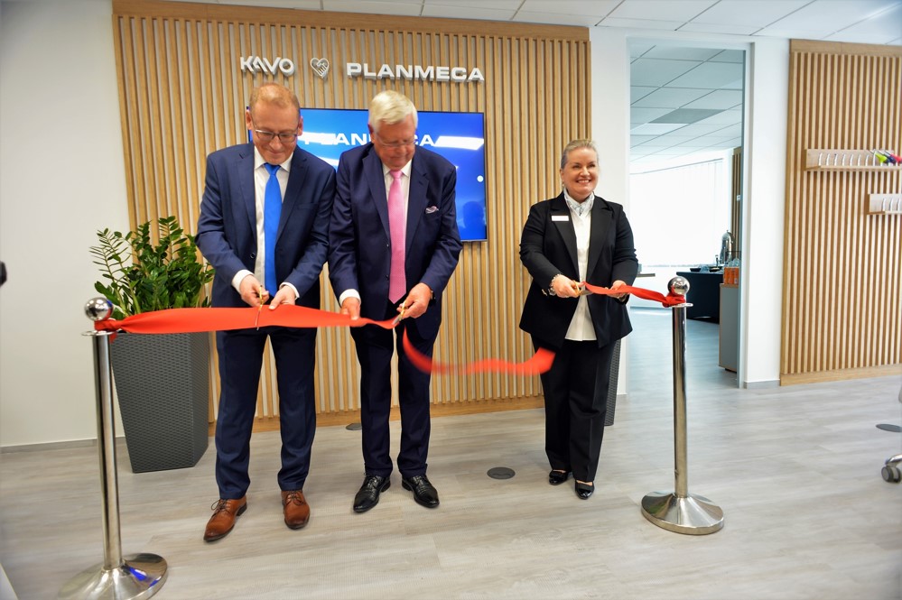 Uroczyste przecięcie wstęgi. Od lewej: Piotr Dąbrowski, Sales & Service Director Planmeca Poland; Heikki Kyöstilä, Prezes i założyciel Grupy Planmeca; Katarzyna Gisman, Member of the Board KaVo Dental Poland & Regional Sales Director KaVo EE.