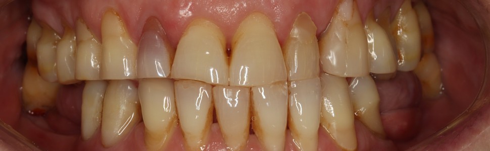W pracy przedstawiono opis przypadku pacjentki, u której w wyniku urazu zgryzowego doszło do wylewu krwi do miazgi i przebarwienia korony zęba siecznego bocznego szczęki. Wykonano leczenie endodontyczne, a następnie wybielono koronę zęba. Był to wstępny etap leczenia. Następnie pacjentka otrzymała plan etapowego i kompleksowego leczenia stomatologicznego obejmującego uzupełnienie braków zębowych i odbudowę prawidłowego kształtu zachowanych zębów w ustalonej prawidłowej terapeutycznej pozycji żuchwy.