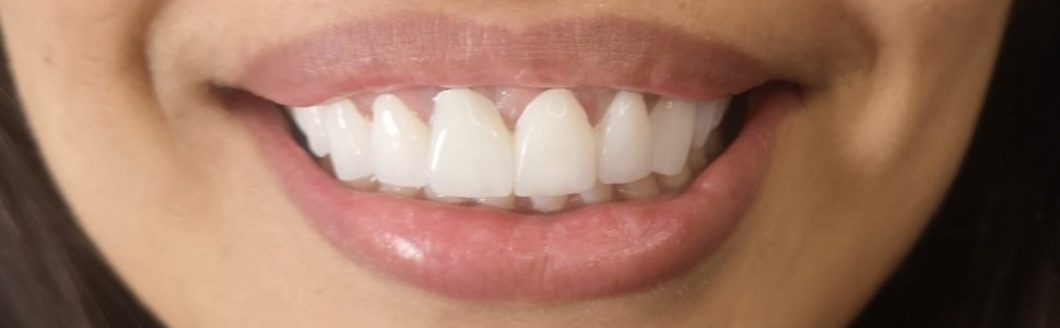 Pacjentka wybrała kolor BL1 i zażyczyła sobie dodatkowe przezierności w okolicy brzegu siecznego. Zdecydowano, że uzupełnienia zostaną wykonane z tlenku cyrkonu w technice cut-back (ryc. 6) oraz policowane porcelaną. Na rycinie 7 widać niewielką przezierność w obszarze brzegu siecznego nowych uzupełnień. Decyzja o wykonaniu licówek z tlenku cyrkonu podjęto w celu uniknięcia różnicy kolorystycznej między koroną na implancie a licówkami. Estetyczny rezultat oraz harmonijny uśmiech potwierdza zdjęcie pozabiegowe (ryc. 8). Według producenta wytrzymałość na zginanie materiału KATANA™ Zirconia UTML wynosi 557 MPa i jest wyższa niż wytrzymałość dwukrzemianu litu czy porcelany skaleniowej. Ponieważ licówki cyrkonowe będą bardziej odporne na siły ścinające, możliwe było wyeliminowanie punktów kontaktu, które przeszkadzały już podczas przymierzania, a nawet bezpieczne modyfikowanie kształtu uzupełnień in vivo. Odbyło się to z użyciem specjalnych wierteł dostosowanych do tlenku cyrkonu, na różnych etapach dopasowywania, zgodnie z życzeniem pacjentki (4).