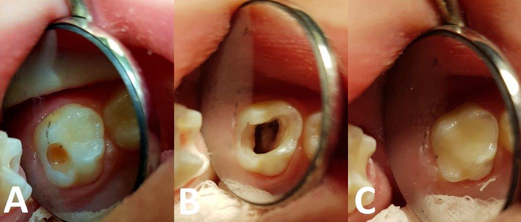 Ryc. 2. Zdjęcia wykonane w trakcie zabiegu pulpotomii z zastosowaniem preparatu zawierającego siarczan żelaza u 2,5-letniej pacjentki. Podczas usuwania zębiny próchnicowej w zębie 65 doszło do zranienia miazgi (vulneratio pulpae cariosa).