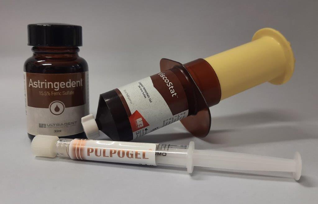 Siarczan żelaza dostępny jest na polskim rynku w postaci preparatów o konsystencji żelu lub płynu. Są to zazwyczaj 20% preparaty (Pulpogel, Chema-Elektromet; Viscostat, Ultradent), choć dostępne są również produkty z mniejszą zawartością siarczanu żelaza (Astringedent, Ultradent – 15,5%) (ryc. 3).