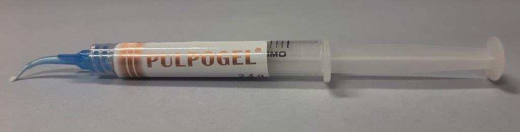 6. ponieważ w wyniku reakcji żelu z krwią tworzą się brunatne skrzepy, należy je po zakończeniu wcierania wypłukać z komory sprayem wodnym z dmuchawki stomatologicznej; z reguły 15-sekundowe wcieranie zapewnia hemostazę; jeśli krwawienie nie ustępuje, to miazga korzeniowa jest najczęściej zmieniona zapalnie i konieczne jest wdrożenie innej procedury;