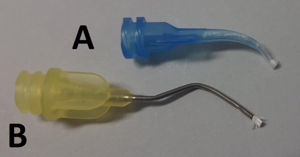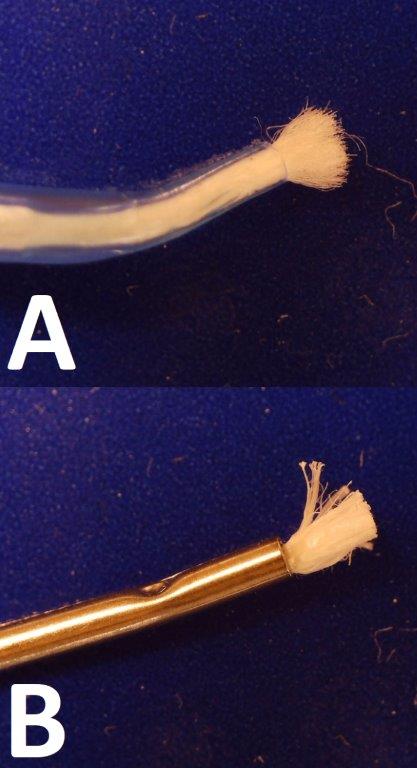 Ryc. 6. Pędzelki zapewniające skuteczne wtarcie żelu hemostatycznego w kikuty miazgi. A. Aplikator Dental-Infusor plastikowy; B. Aplikator Dental-Infusor metalowy.