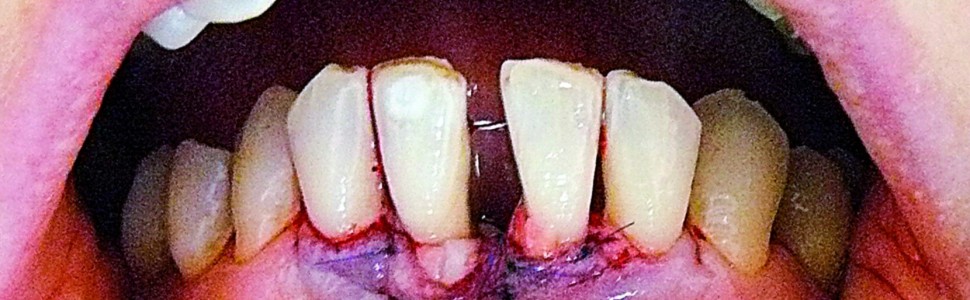 Z wywiadu ustalono, że pacjentka nieregularnie korzystała z opieki stomatologicznej, głównie było to leczenie próchnicy i profesjonalne oczyszczanie zębów. Jej stan zdrowia był ogólnie dobry, nie przyjmowała żadnych leków, a głównym problemem stała się zaburzona estetyka. W czasie badania klinicznego nie stwierdzono obecności stanu zapalnego, nie obserwowano krwawienia, głębokość kieszonek przyzębnych nie przekraczała 4 mm. Obserwowano niewielką ilość miękkich i twardych złogów nazębnych. Manifestacją zaawansowanej redukcji tkanek przyzębia były liczne recesje, ruchomość przyśrodkowych zębów siecznych górnych i dolnych na granicy I i II stopnia oraz migracja patologiczna skutkująca dysfunkcją żucia. Największe recesje obserwowano na powierzchni wargowej i mezjalnej przyśrodkowych zębów siecznych dolnych. W okolicy zęba 41 odpowiednio 3,5 i 6 mm, w okolicy zęba 31 odpowiednio 2 i 3,5 mm. Były to recesje typu 3 (RT3), dodatkowo występował deficyt dolnej brodawki centralnej typu 2 według Nordlanda i Tarnowa, ekstruzja zębów przednich z rotacją zęba 41 (ryc. 1) oraz diastema. Wykonane zdjęcie rentgenowskie ujawniło poziomą destrukcję części zębodołowej żuchwy w przestrzeni pomiędzy przyśrodkowymi zębami siecznymi dolnymi (ryc. 2). Pacjentka wymagała kompleksowej rehabilitacji, której głównym elementem było leczenie ortodontyczne i protetyczne. W pierwszej fazie zaplanowano jednak chirurgiczne pokrycie recesji, przygotowujące okolicę zębów siecznych dolnych do leczenia ortodontycznego. Celem była częściowa redukcja recesji dziąsłowych, poszerzenie strefy dziąsła skeratynizowanego w obszarze przyśrodkowych zębów siecznych dolnych, a także uzysk przyczepu łącznotkankowego w przestrzeni międzyzębowej z poprawą położenia brodawki międzyzębowej. Dwa tygodnie przed planowanym zabiegiem wykonano skaling z gładzeniem powierzchni korzeni, instruktaż higieny oraz tymczasowo – na czas leczenia chirurgicznego unieruchomiono zęby sieczne dolne, wykorzystując splecioną ligaturę drucianą zamocowaną materiałem kompozycyjnym na powierzchni językowej zębów.