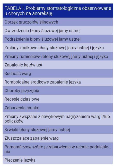Zmiany erozyjne u osób z zaburzeniami odżywiania są zazwyczaj zlokalizowane w rejonie językowych powierzchni przednich zębów szczęki. Anoreksji mogą również towarzyszyć nadwrażliwość zębiny i kserostomia. W związku z nasileniem procesów patologicznych nawet u młodych osób może dochodzić do utraty licznych zębów (tab. I).