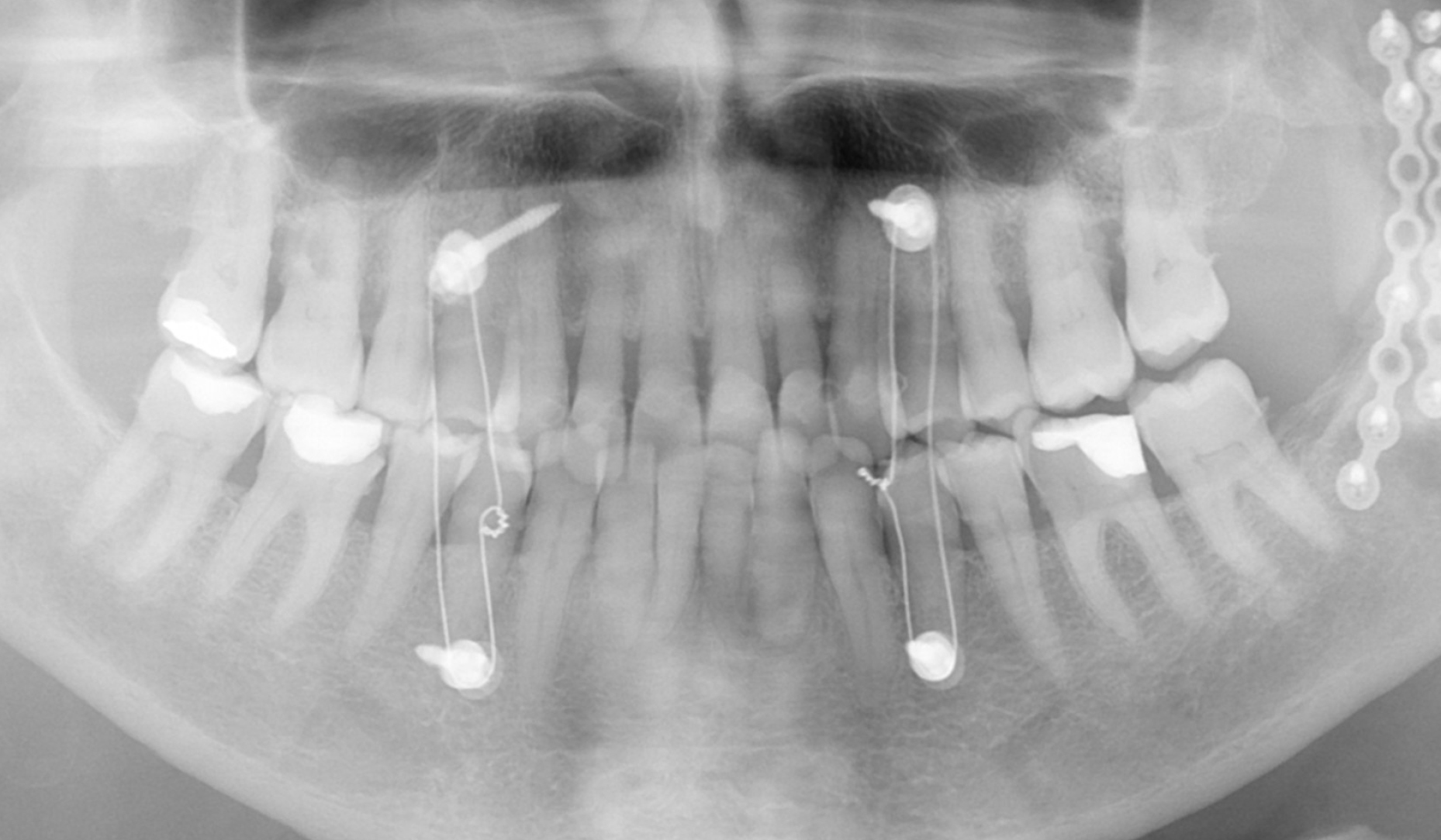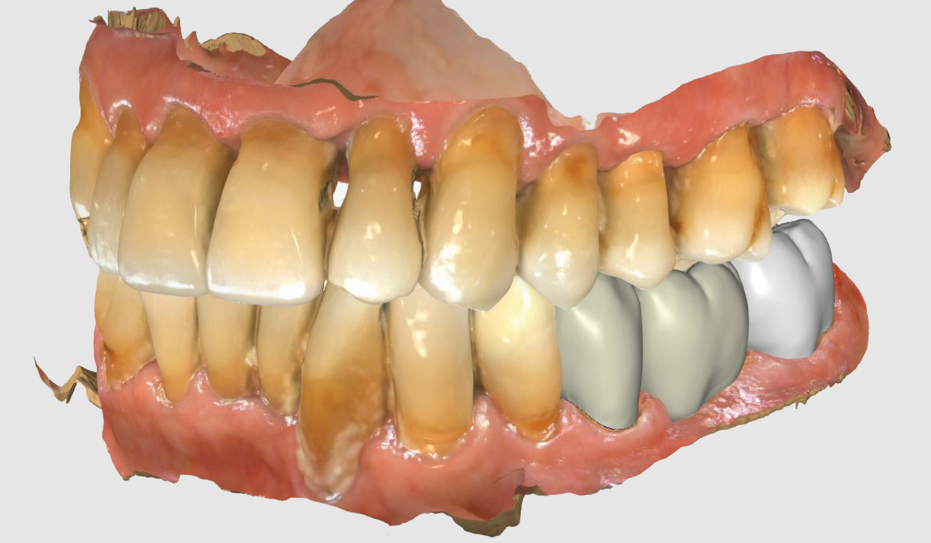 Do kliniki zgłosiła się 85-letnia pacjentka po osteosyntezie wieloodłamowego złamania żuchwy, którego doznała podczas upadku. W trakcie gojenia doszło do masywnej dyskluzji w lewym, tylnym obszarze żuchwy (zęby 34 do 37; notyfikacja FDI). Pacjentka chciała odzyskać prawidłową funkcję żucia w tym obszarze. Po leczeniu endodontycznym dwóch zwichniętych zębów siecznych centralnych, które zostały replantowane w szpitalu, oraz leczeniu periodontologicznym, zaplanowano podniesienie zgryzu po lewej stronie.