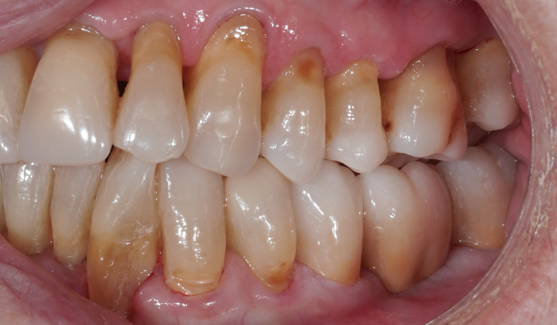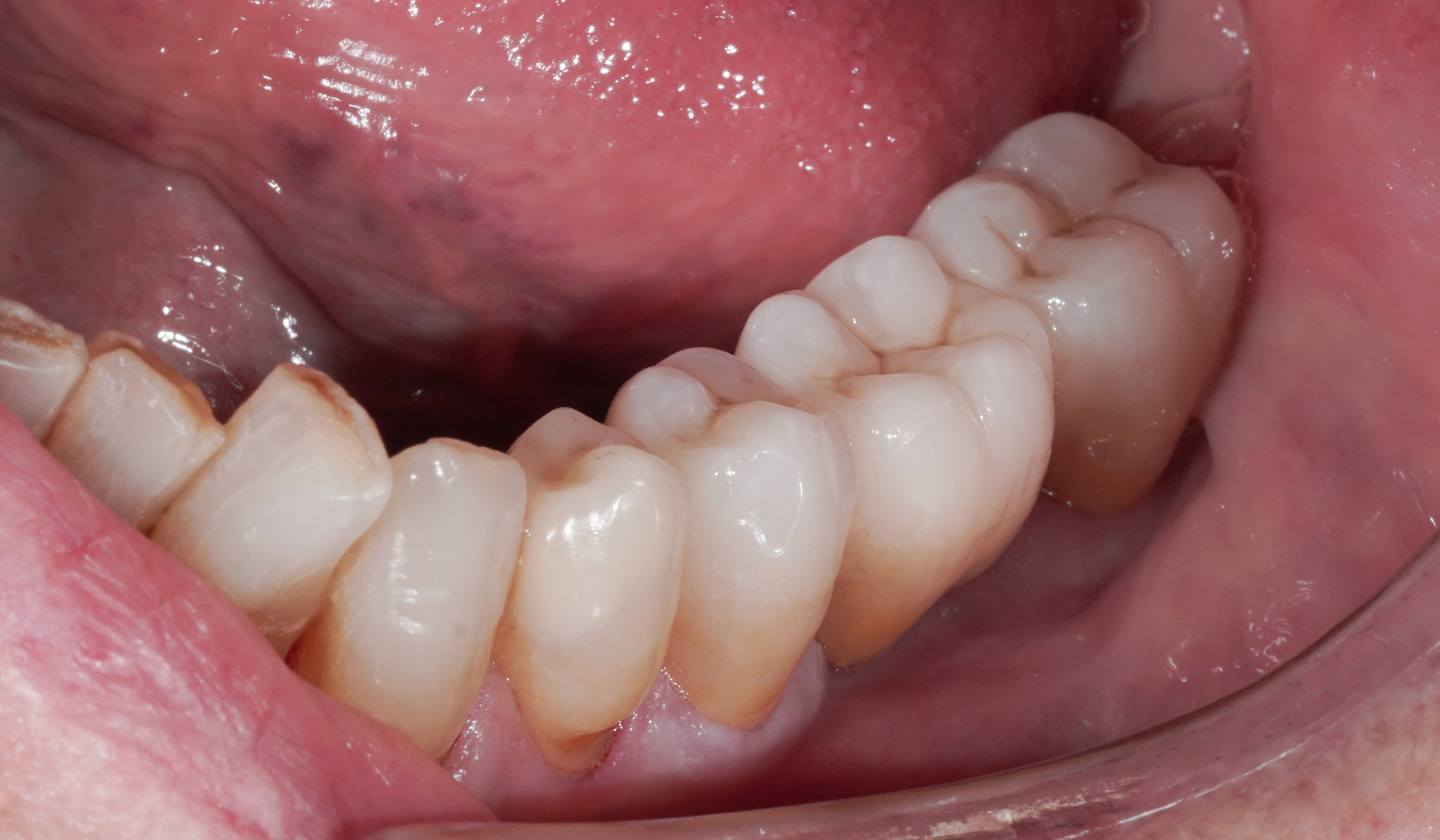Ryc. 11. Stan kliniczny po odbudowie zębów za pomocą nakładu z dwukrzemianu litu i mostu z tlenku cyrkonu KATANA™.