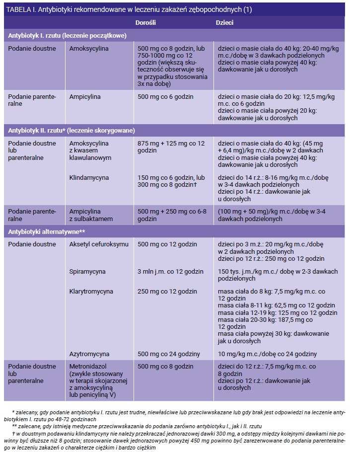 - Lista zalecanych leków w empirycznej antybiotykoterapii zakażeń zębopochodnych stanowi załącznik do tej rekomendacji (tabela I).