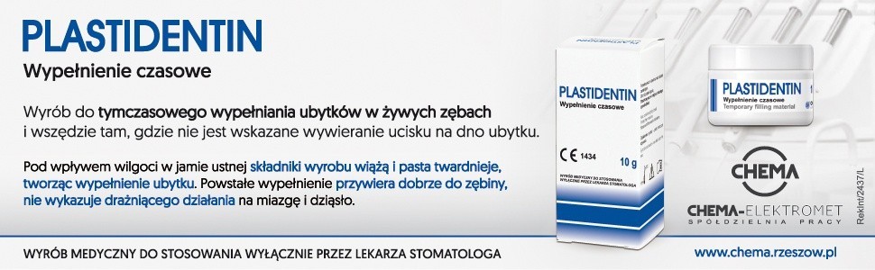 Plastidentin to wyrób do tymczasowego wypełniania ubytków w żywych zębach i wszędzie tam, gdzie nie jest wskazane wywieranie ucisku na dno ubytku. Pod wpływem wilgoci w jamie ustnej składniki wyrobu wiążą i pasta twardnieje, tworząc wypełnienie ubytku. Powstałe wypełnienie przywiera dobrze do zębiny, nie wykazuje drażniącego działania na miazgę i dziąsło. Wyrób twardnieje w ciągu około 2 godzin; w tym czasie pacjent powinien powstrzymać się od spożywania posiłków. Wypełnienie czasowe ze względu na brak trwałości powinno pozostać w zębie przez okres 1 – 2 tygodni. Pudełko zawiera 10g wyrobu w postaci pasty.