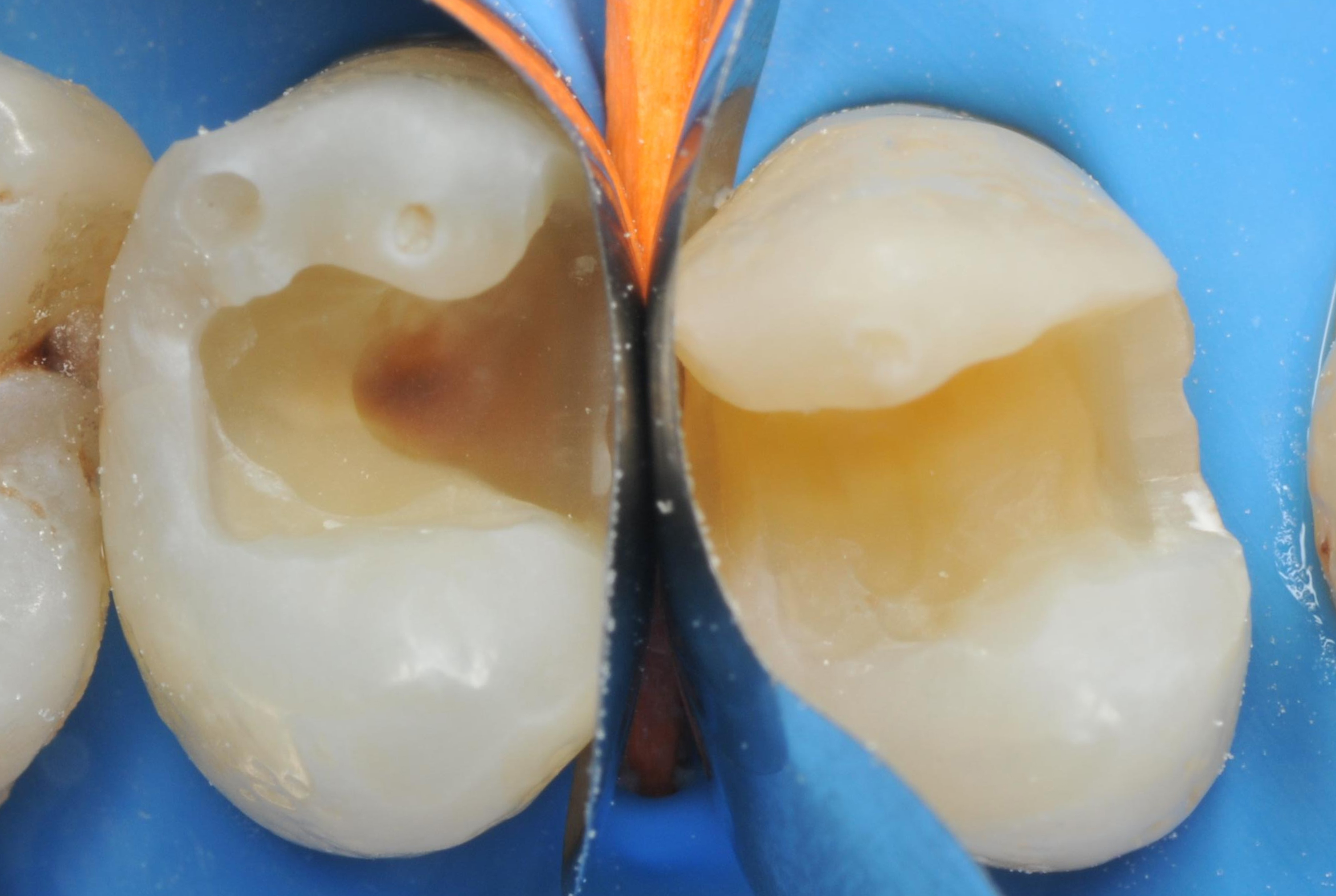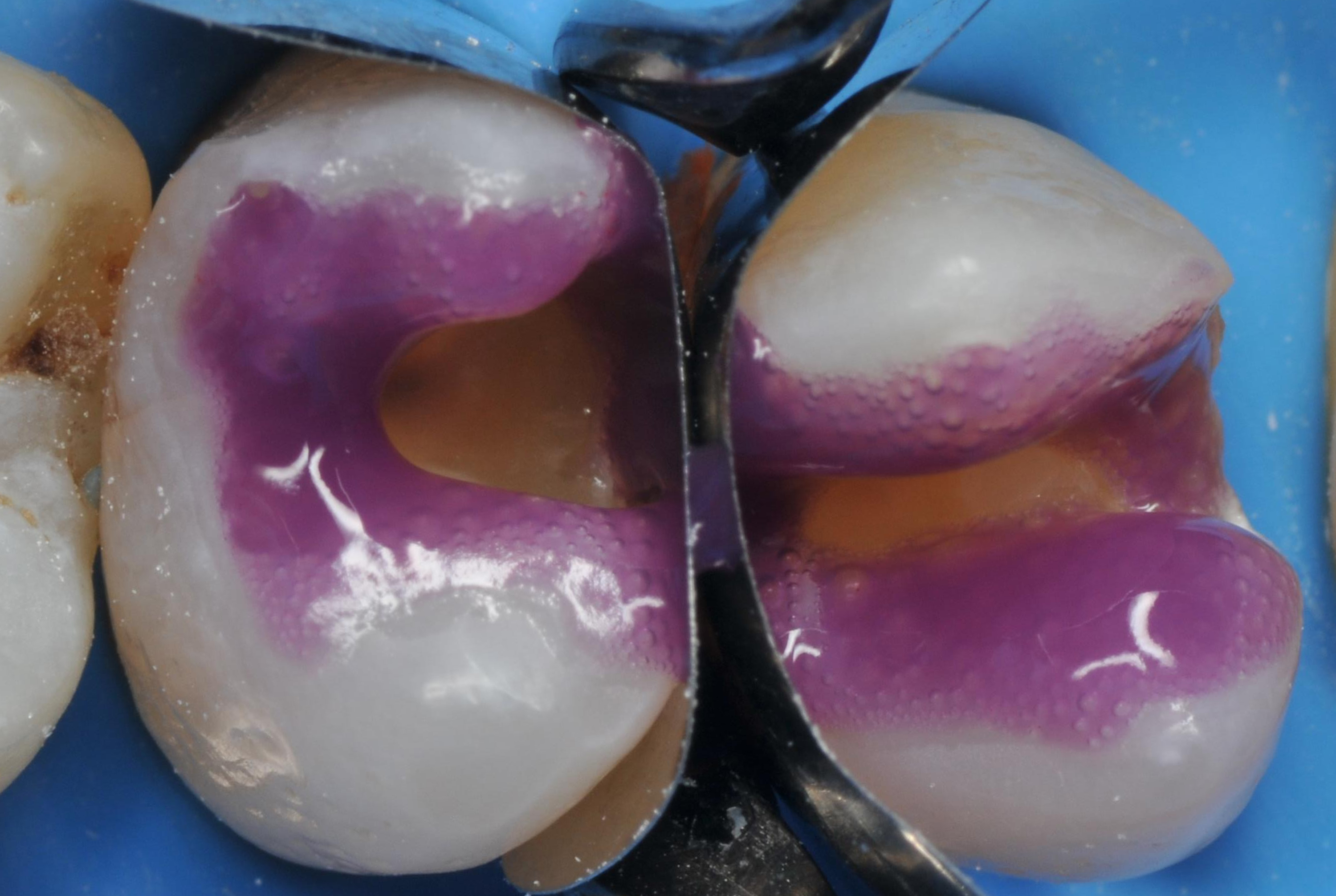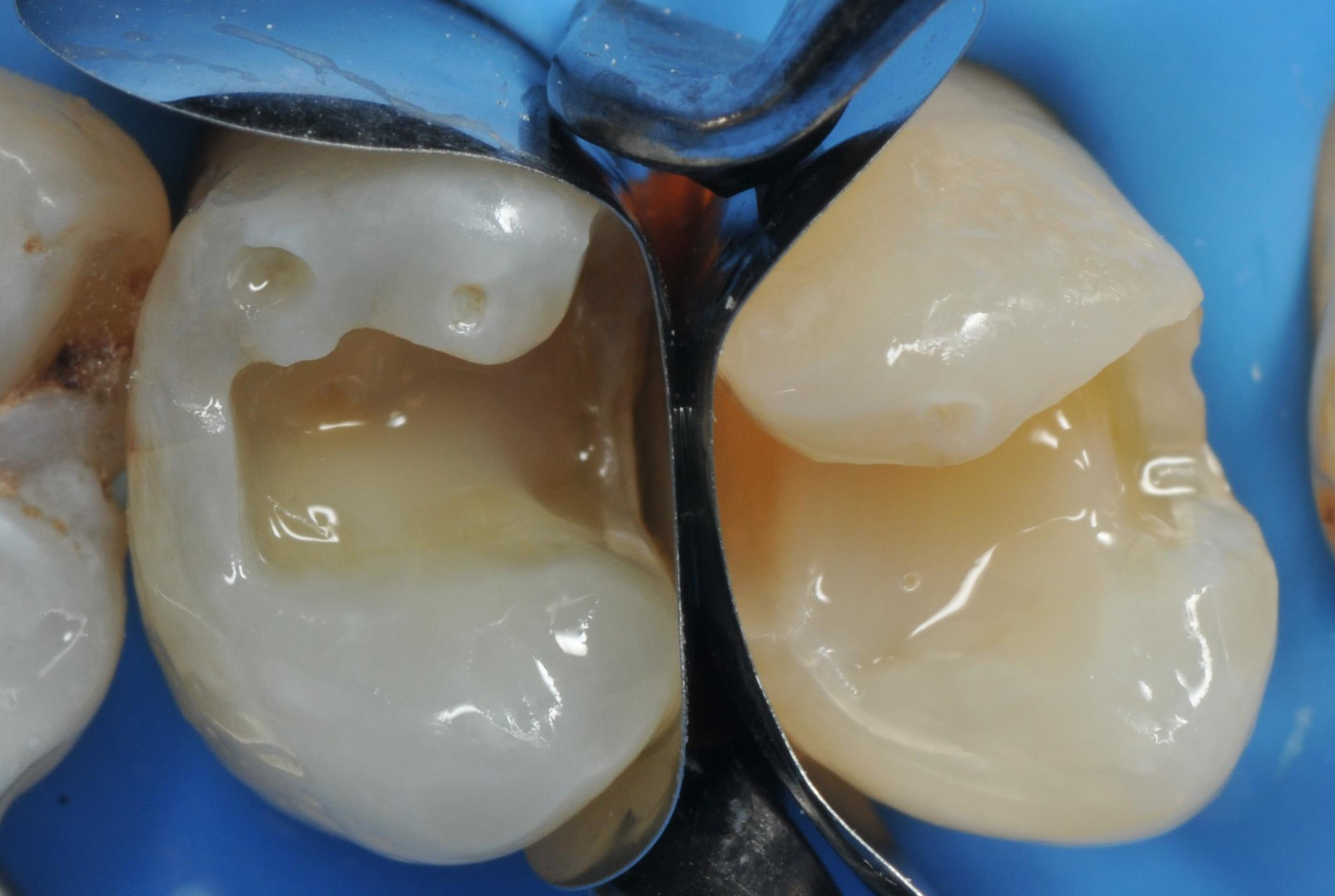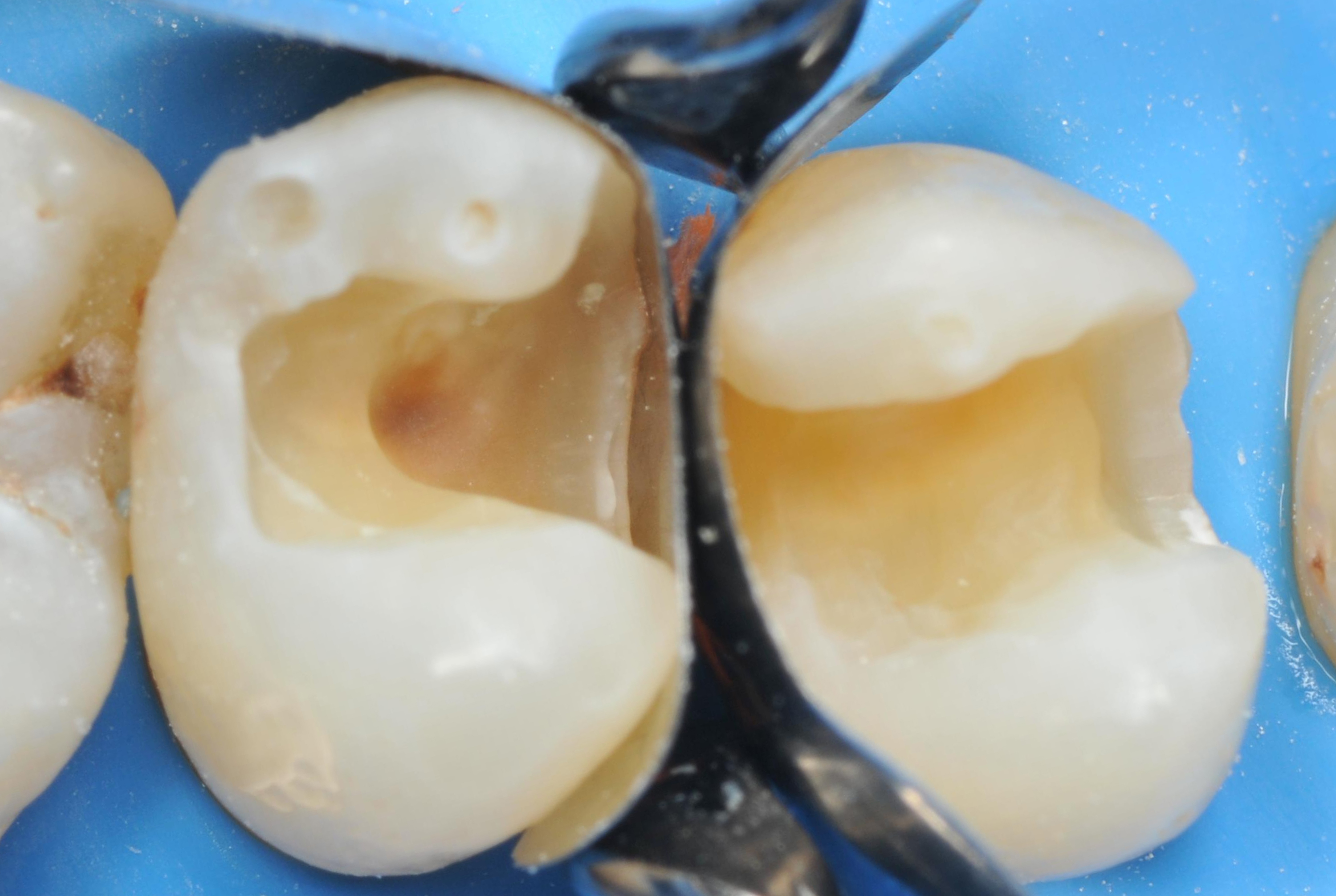 Po założeniu koferdamu usunięto stare wypełnienia i uzyskano dwa ubytki klasy II (ryc. 2).