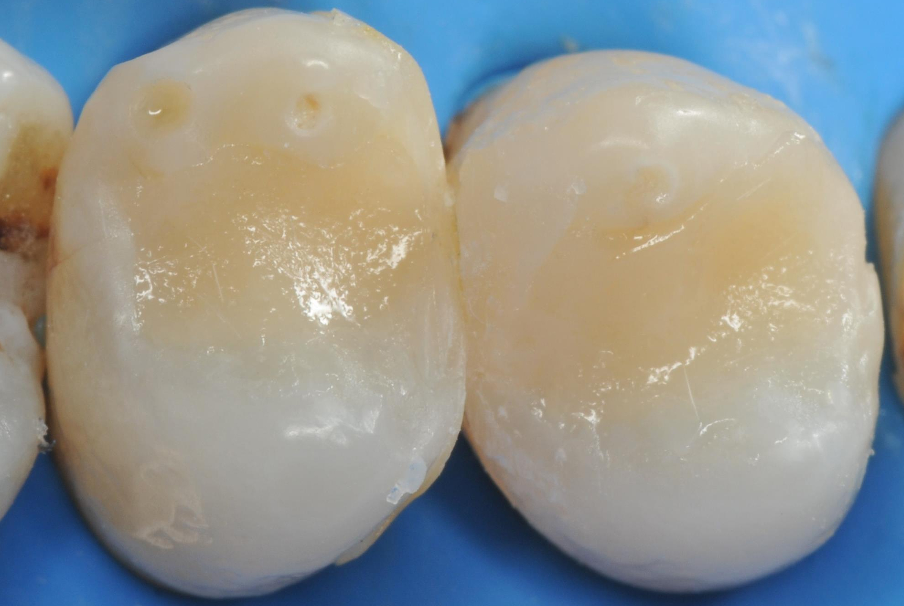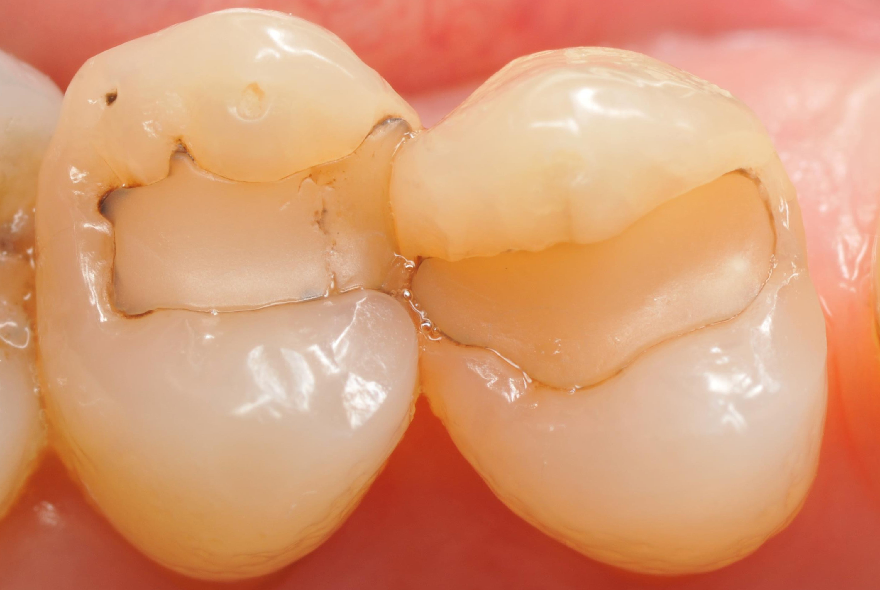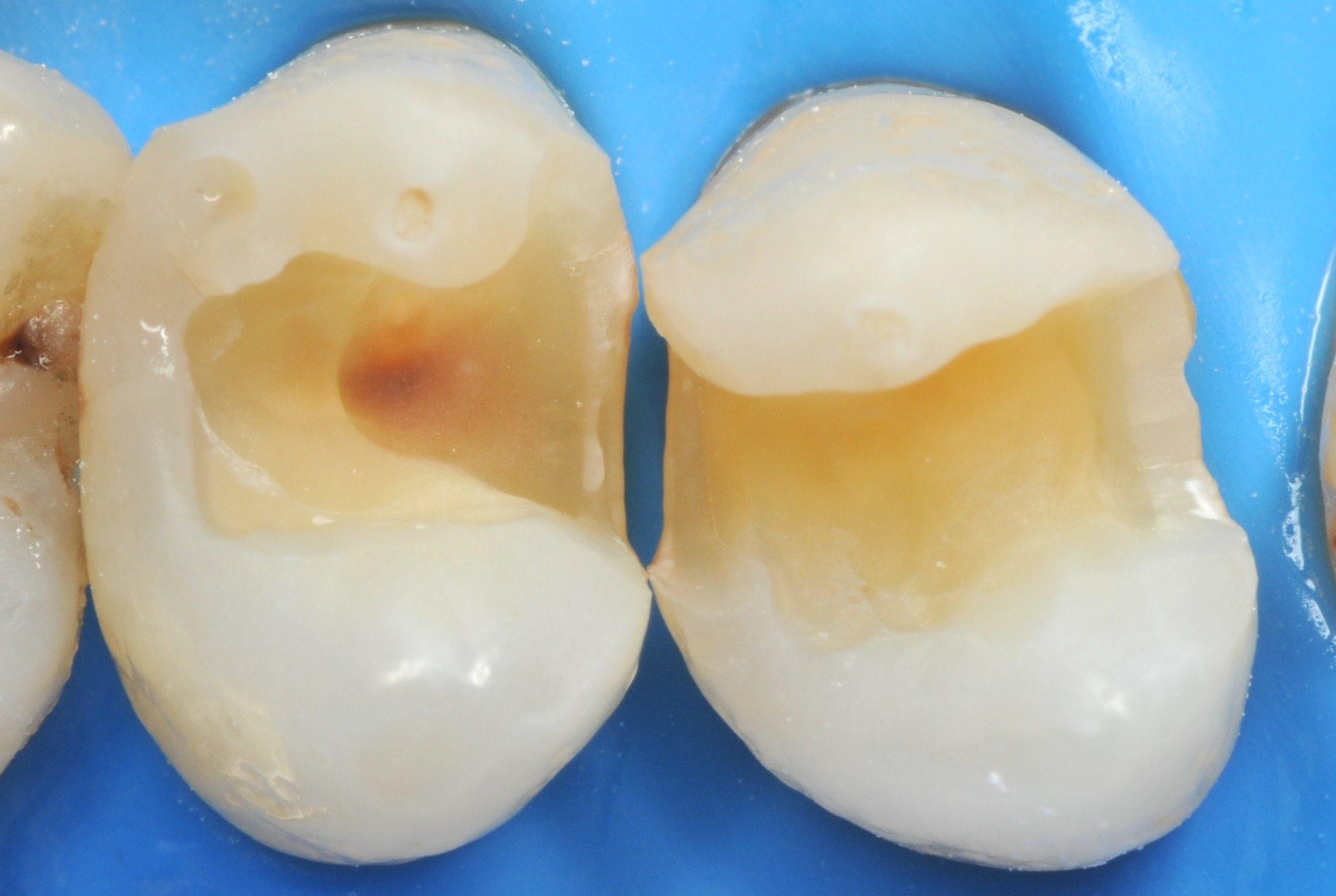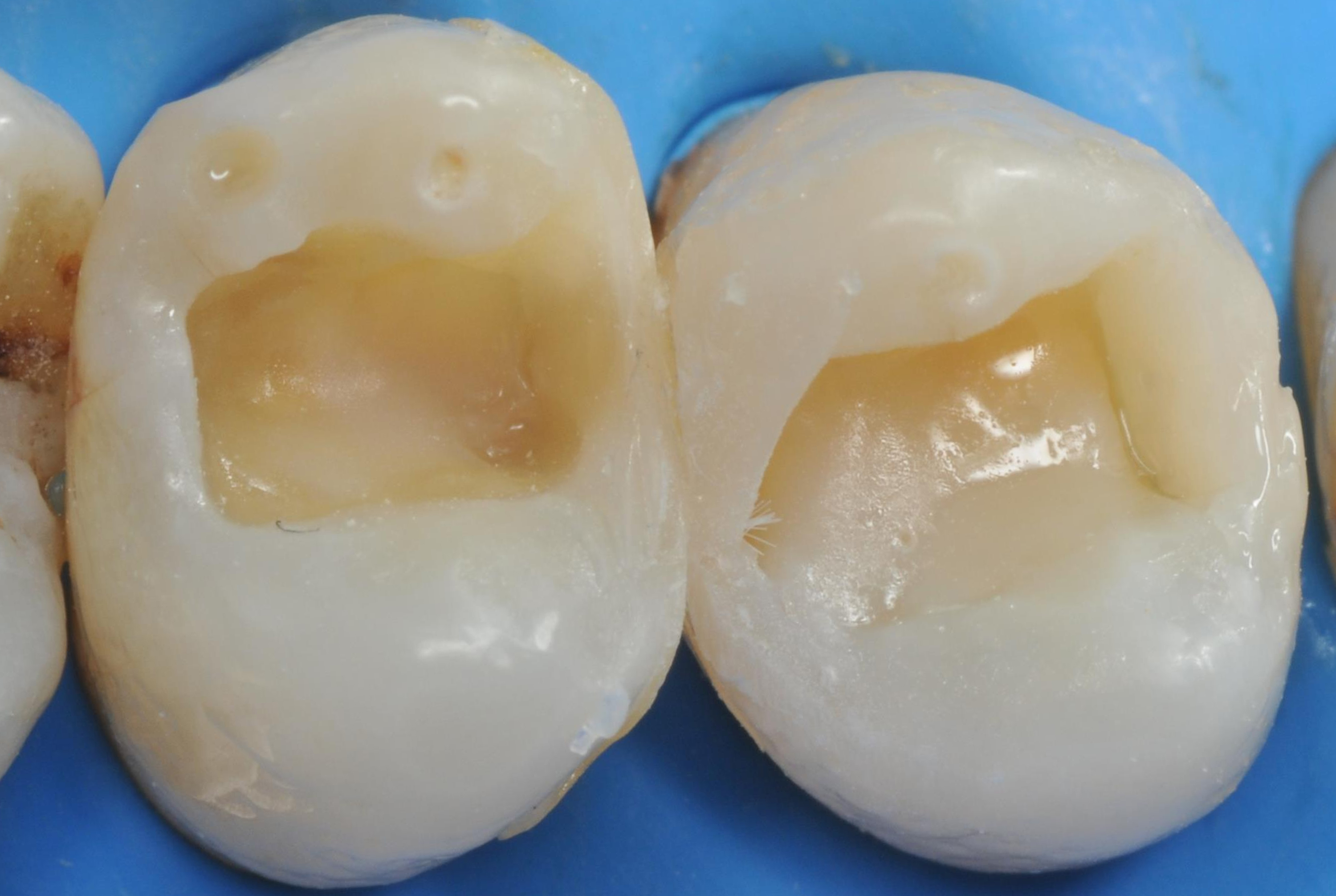 Po założeniu koferdamu usunięto stare wypełnienia i uzyskano dwa ubytki klasy II (ryc. 2).