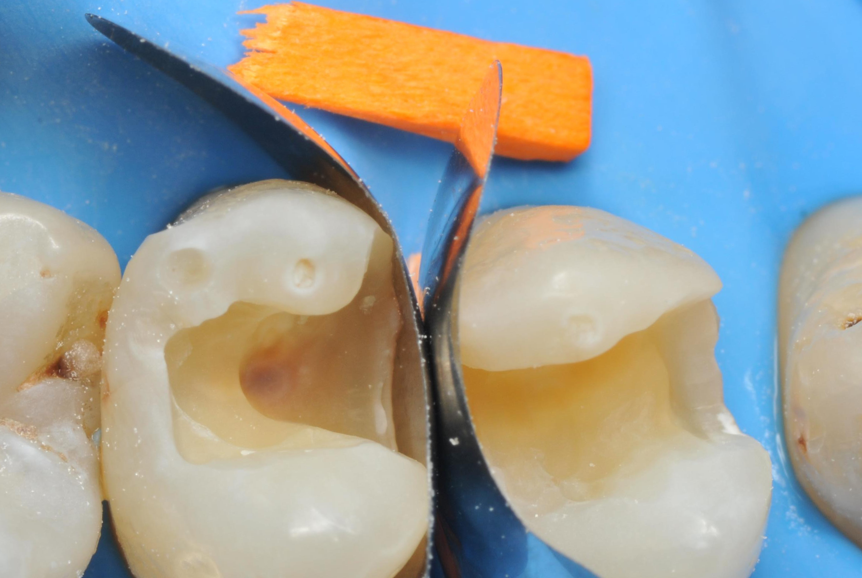 Po przygotowaniu ubytków, do każdego z nich umieszczono dwie sekcyjne matryce, aby uzyskać jak najściślejszy kontakt, a następnie zabezpieczono je pomarańczowym drewnianym klinem (ryc. 3).