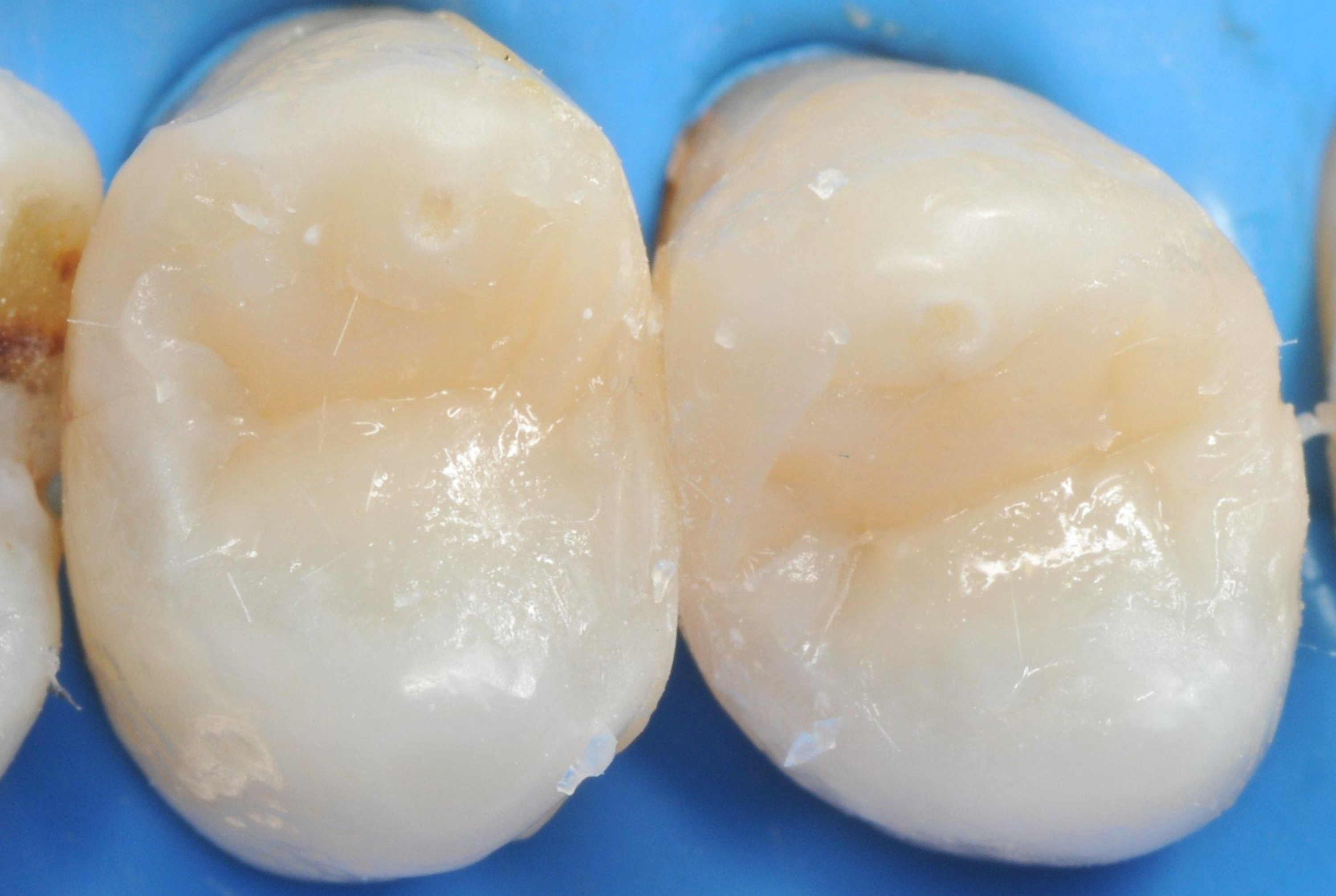 W ostatnim etapie protokołu adhezji nałożono cienką warstwę kompozytu o płynnej konsystencji (SimpliShade™ Bulk Fill Flow firmy Kerr), aby pokryć i zabezpieczyć warstwę hybrydową oraz wyrównać dno ubytku. Odtwarzając wszystkie ściany międzyzębowe, uzyskano dwa ubytki klasy I (ryc.8).