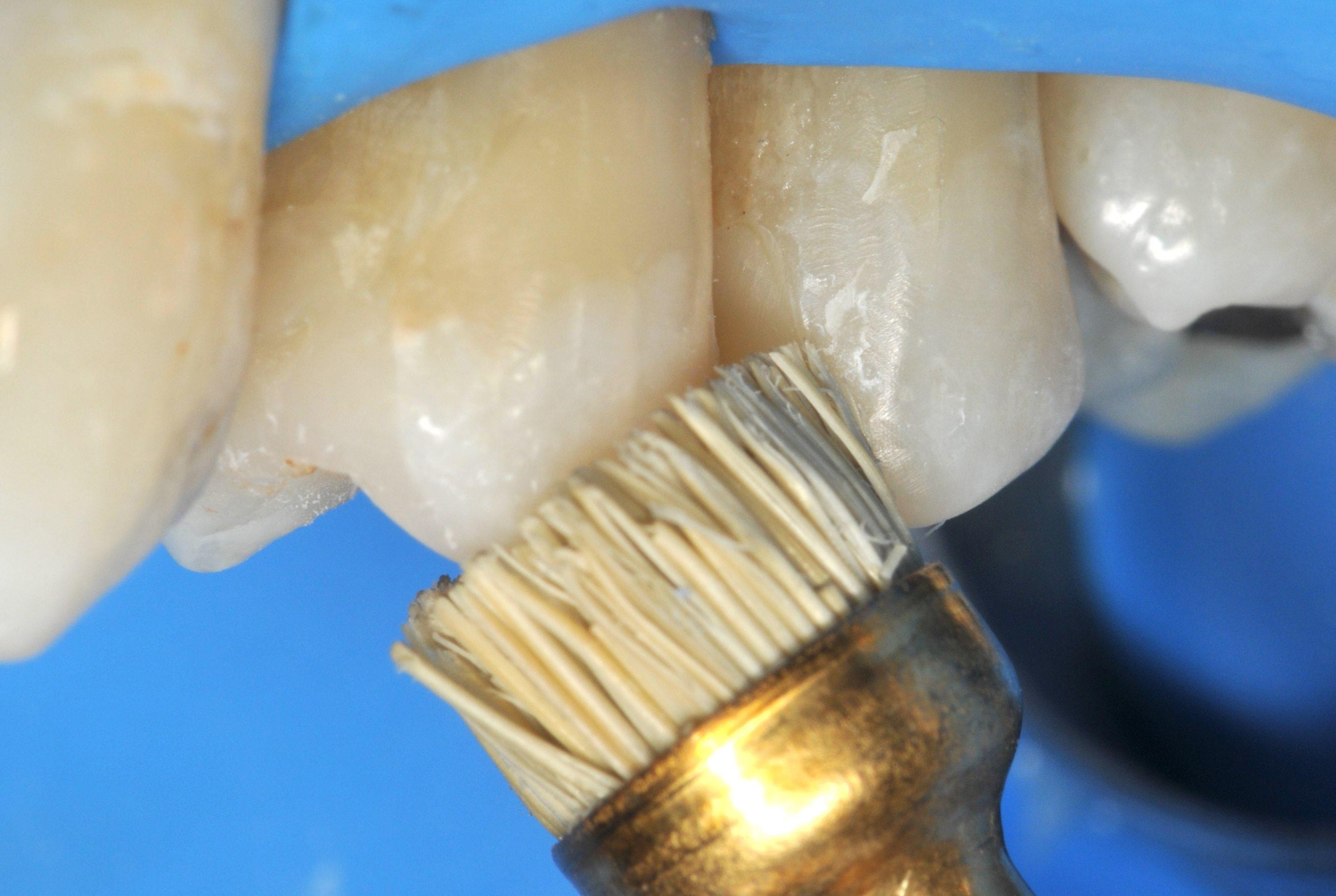 Po wypłukaniu i osuszeniu przez tyle samo czasu, ile zajęło trawienie, nałożono OptiBond™ Universal firmy Kerr w celu uzyskania adhezji (ryc. 7).