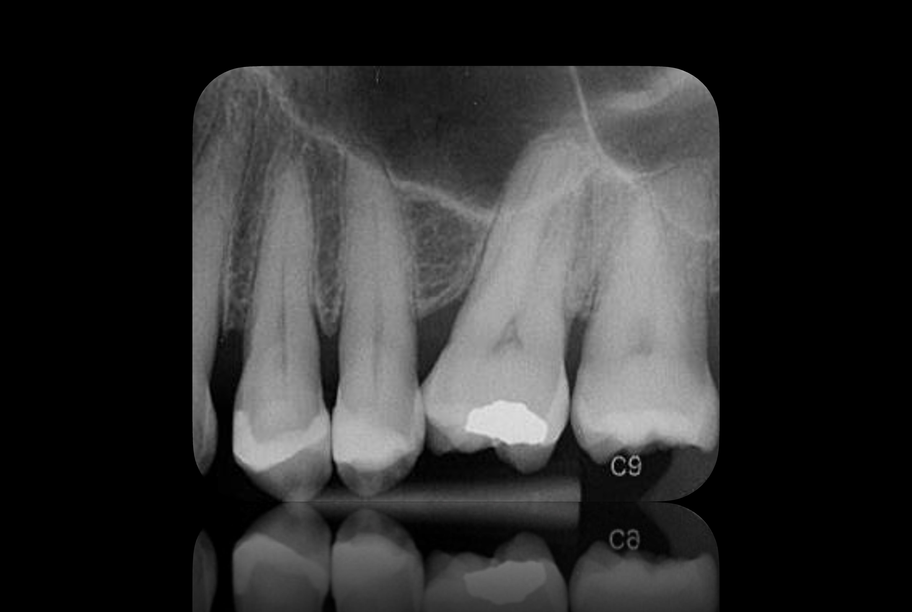 Badanie rentgenowskie nie wykazało żadnych przejaśnień okołowierzchołkowych w okolicy dwóch przedtrzonowców, co oznacza, że po miesiącu obserwacji miazga zachowała żywotność (ryc.18).