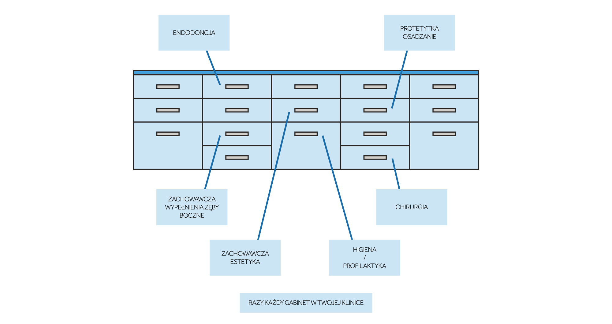 Przechowywanie w gabinecie to kwestia ważna tak samo, jak wygodny unit, czy zgrana praca z asystą. To, jak szybko asysta jest w stanie skompletować zestaw do bieżącej procedury, czy to, jak łatwy ma dostęp do materiałów i narzędzi, wpływa nie tylko na jej komfort pracy, ale też na szybkość i sprawność funkcjonowania całej kliniki. A to tylko wierzchołek góry lodowej, bo w grę wchodzą też kwestie bezpieczeństwa, prawdopodobieństwo popełnienia błędu, czy przestrzeganie procedur w przypadku nieprzewidzianych sytuacji.