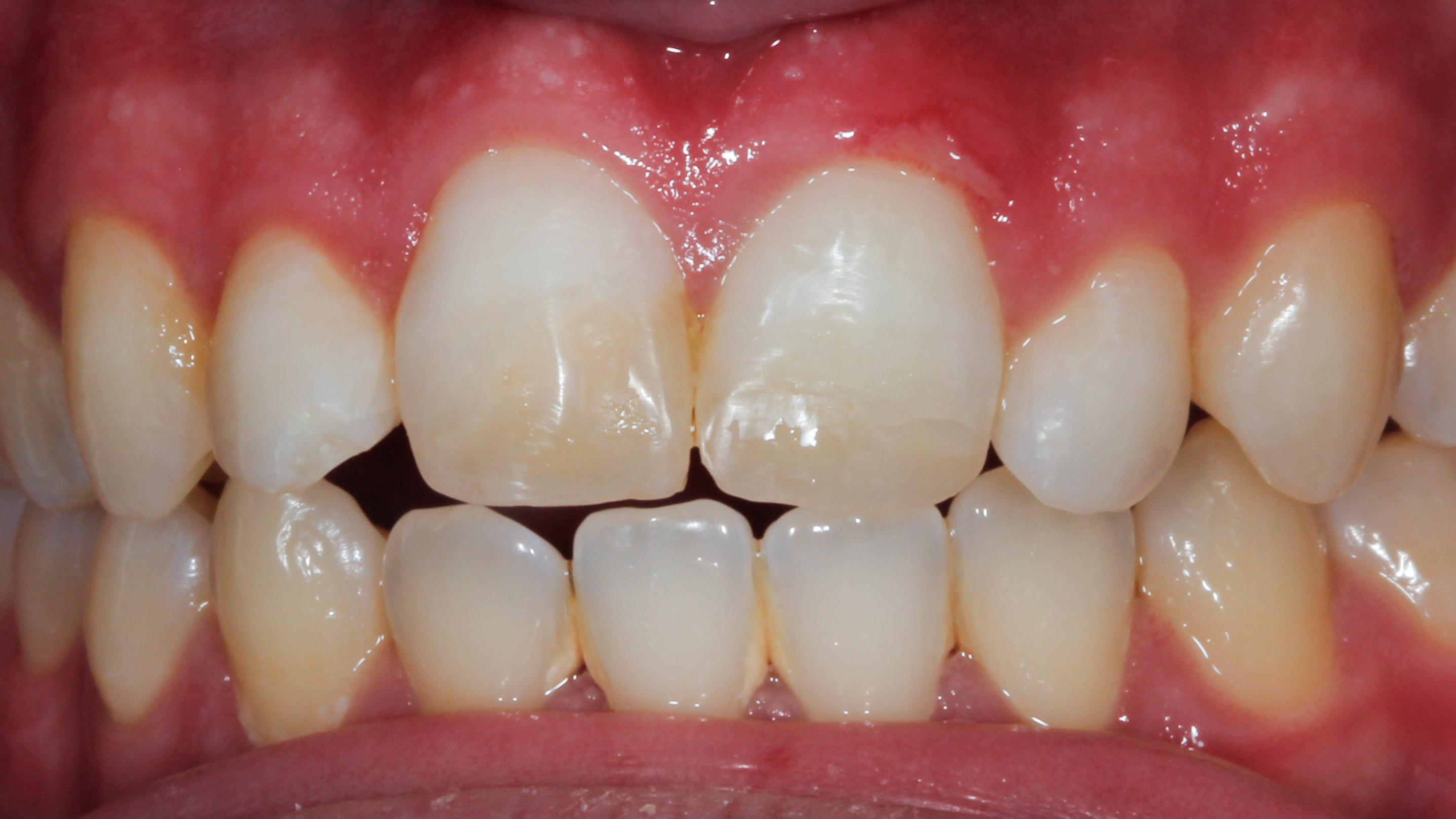 Zęby 11 i 21 nie reagowały na zimno, były bolesne opukowo i przy dotyku, ale nie wykazywały zwiększonej ruchomości. Zęby 12 i 22 nie wykazały odchyleń od normy przy opukiwaniu, reakcji na zimno ani w zakresie ruchomości. Pacjent podawał brak kontaktów zgryzowych na zębach przednich przed urazem i jego zdaniem nie uległy one zauważalnemu przemieszczeniu na skutek urazu.