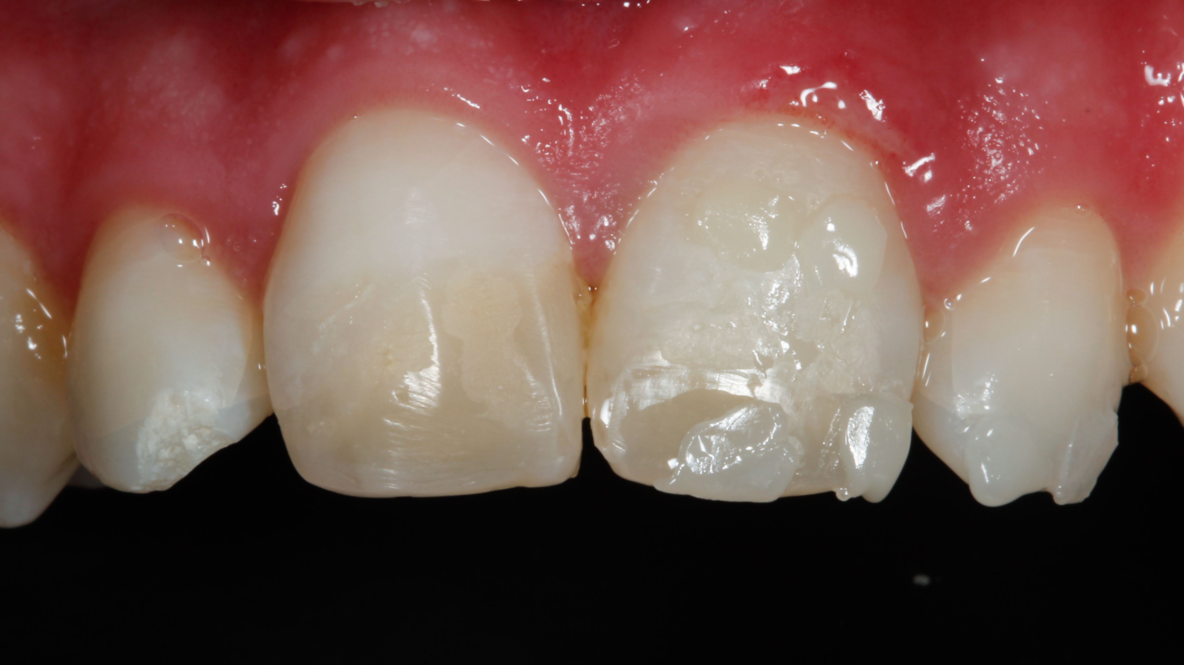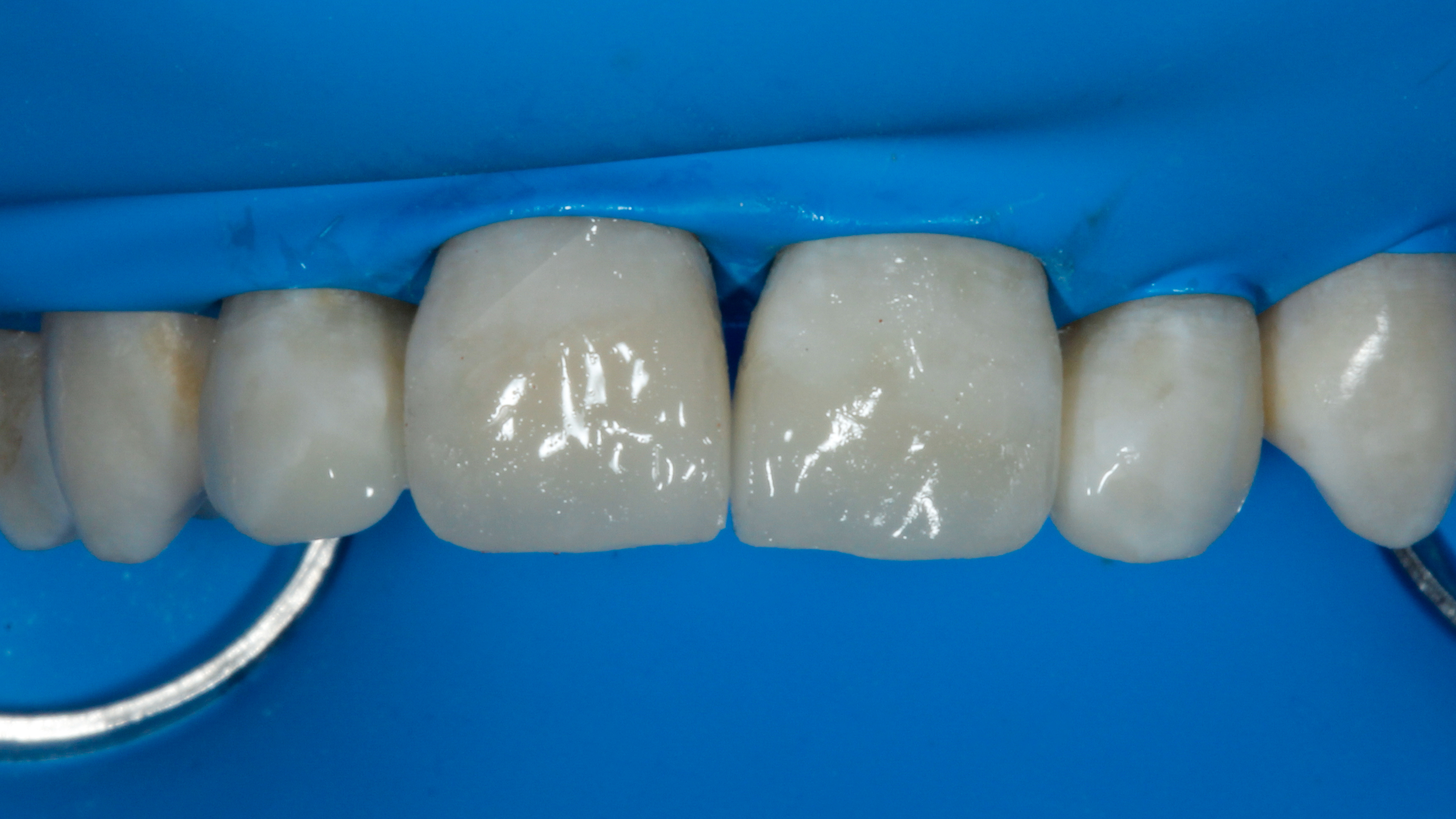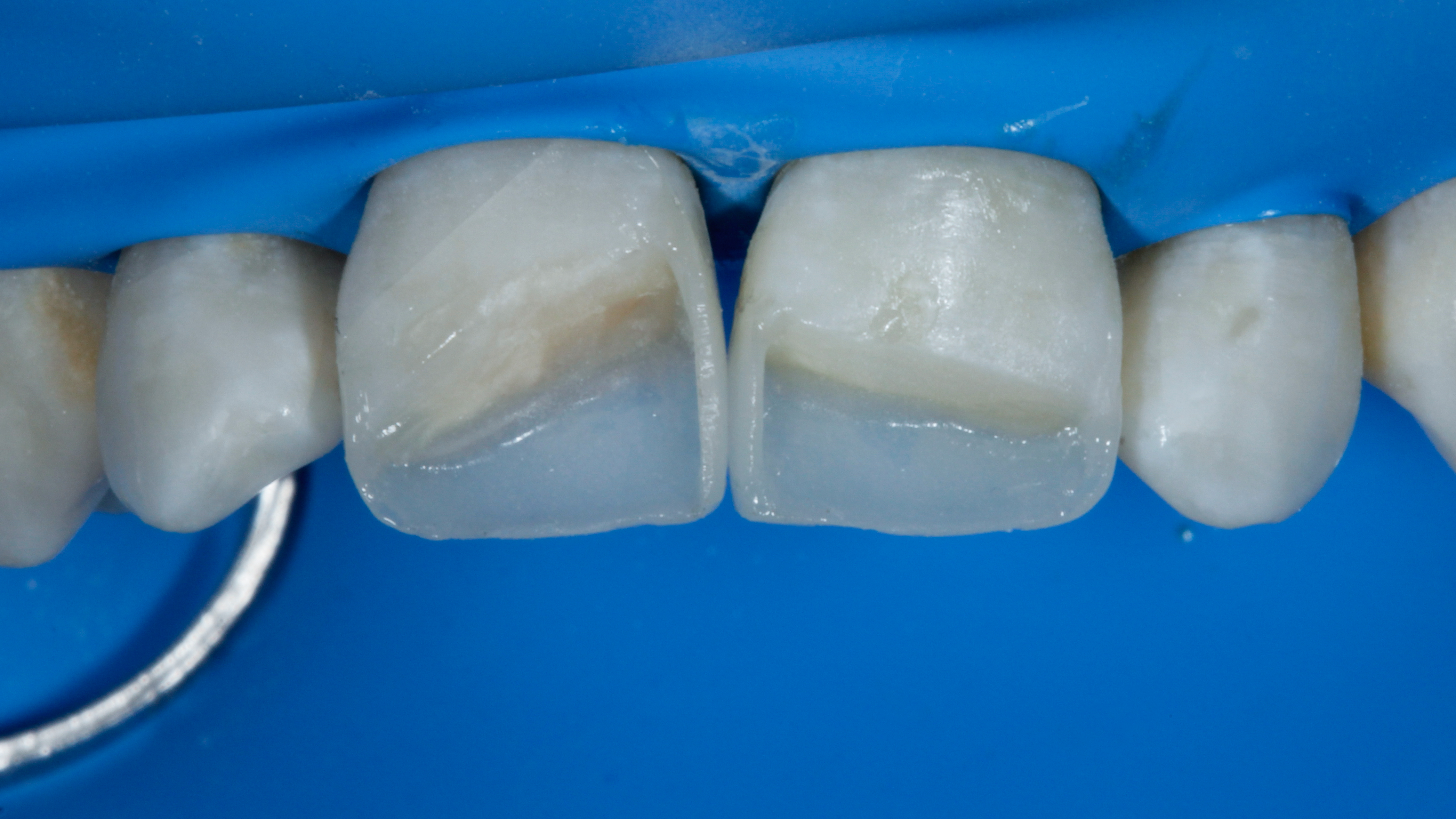 Protokół adhezyjny obejmował selektywne wytrawienie powierzchni szkliwa 36% kwasem ortofosforowym oraz aplikację uniwersalnego systemu wiążącego Scotchbond Universal Plus (3M ESPE) na obszarze nieznacznie wykraczającym poza zakres preparacji, aby zagwarantować pewną adhezję na krawędziach przyszłej odbudowy.