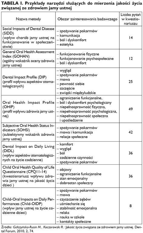 Do oceny jakości życia związanej ze zdrowiem jamy ustnej pracownicy gabinetu stomatologicznego mogą używać narzędzi kwestionariuszowych, które równocześnie mogą posłużyć jako element badań marketingowych. W tabeli I przedstawiono wybrane przykłady metod mierzenia jakości życia związanej ze zdrowiem jamy ustnej.