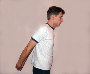 4. Wyprost tułowia za splecionymi za plecami dłońmi (ryc. 1). Unosimy ręce lekko w górę (ok. 5-10 cm) i w tej pozycji wykonujemy głęboki wdech, zatrzymujemy oddech i pozycję, po kilku sekundach wydech – opuszczamy ręce. Ćwiczenie powtarzamy 4 razy.