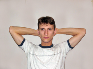 7. Izometryczne, tj. bez wykonywania ruchu, napięcie tylnych mięśni szyi. W pozycji wyprostowanej opieramy dłonie o potylicę, wywierając lekki nacisk dłońmi do przodu, a głową do tyłu (ryc. 4). Napięcie utrzymujemy od 5 do 10 s, ćwiczenie powtarzamy 4 razy.