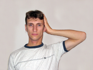 8. Izometryczne napięcie bocznych mięśni szyi. Podobnie jak w poprzednim ćwiczeniu wywieramy nacisk jedną dłonią na okolicę ciemieniową, a głową w przeciwną stronę (ryc. 5). Napięcie utrzymujemy od 5 do 10 s, ćwiczenie powtarzamy 4 razy na prawą stronę i 4 razy na lewą,