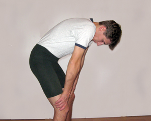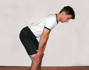 9. Koci grzbiet w pozycji stojącej, w lekkim rozkroku z ugiętymi kolanami (ryc. 6a, 6b). Wdech przy prostych plecach, wydech przy zaokrąglonych. Ćwiczenie powtarzamy 6 razy.