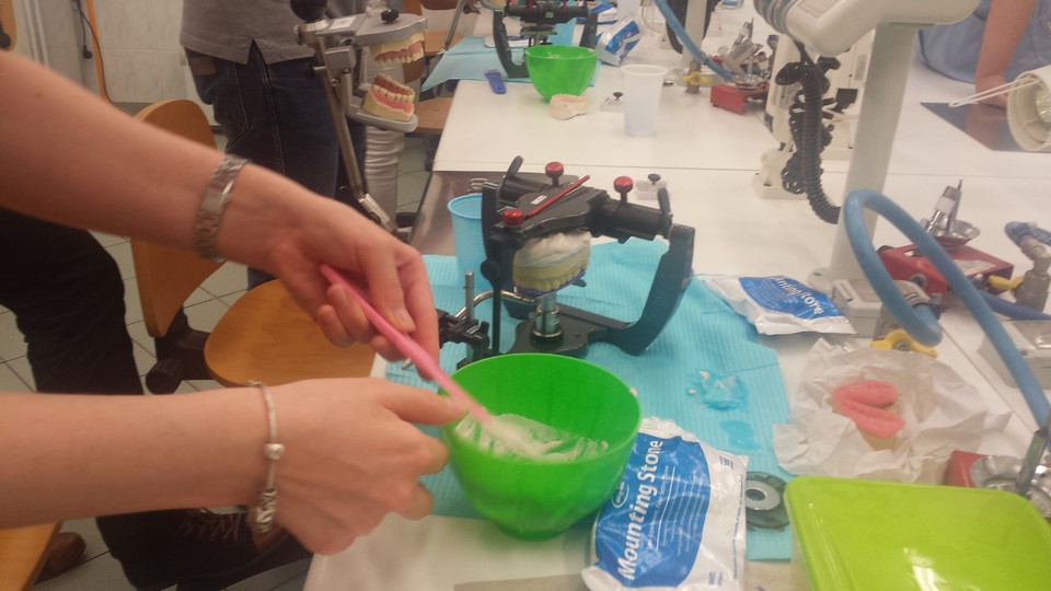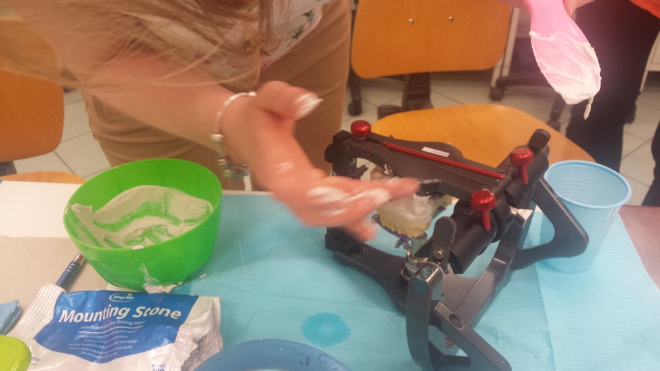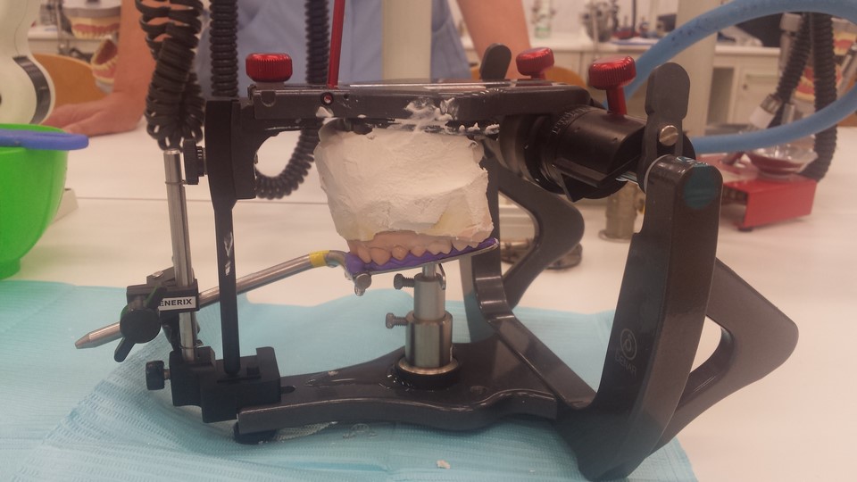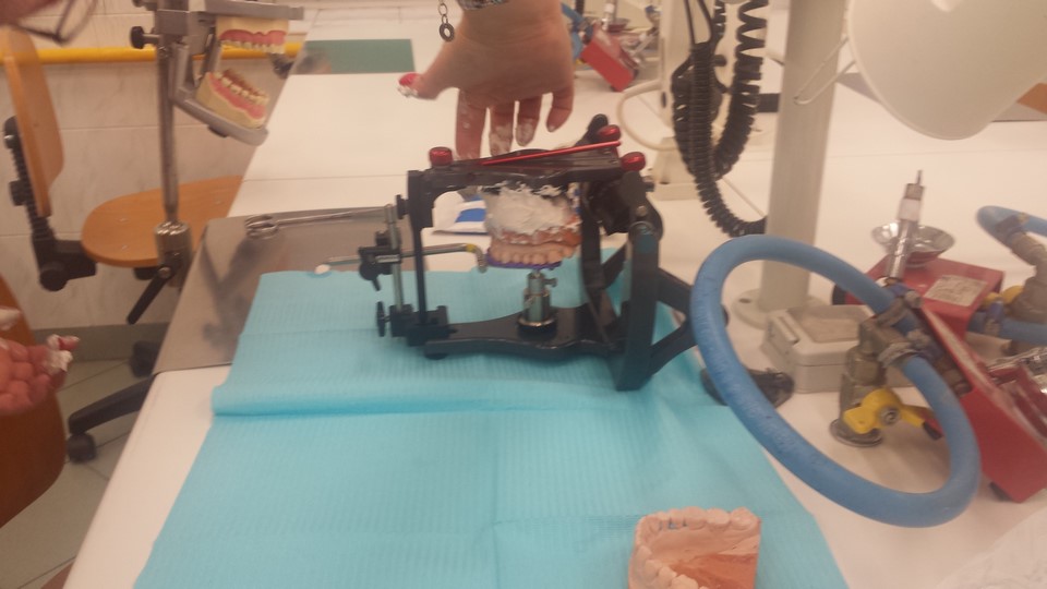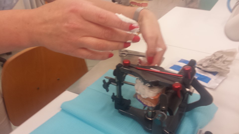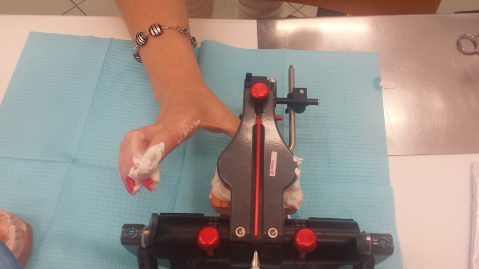 - przy pomocy łuku twarzowego i wykonanych rejestratów zwarcia oprawi modele własne w artykulatorze i przeprowadzi analizę – pierwszy kontakt międzyzębowy w relacji centralnej, poślizg centryczny – analiza kierunku,