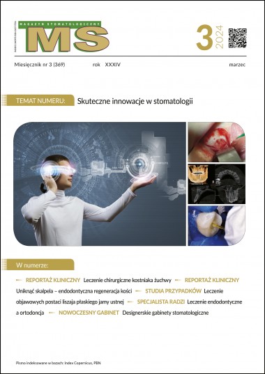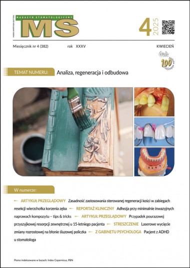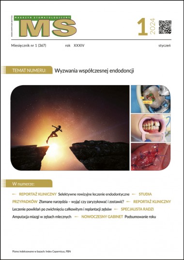 Magazyn Stomatologiczny "Magazyn Stomatologiczny" - czasopismo branżowe ukazujące się od roku 1991 jako miesięcznik. Jest pismem specjalistycznym przeznaczonym dla stomatologów. Zawiera stałe rubryki: temat miesiąca, edukacja, stomatologia praktyczna, vademecum stomatologa. Pragnąc ułatwić lekarzom stomatologom dopełnienie obowiązku doskonalenia zawodowego, magazyn wprowadził od numeru 4/2006 program edukacyjny. Obecnie nakład wynosi 9500 egz. Redaktorem naczelnym jest prof. dr hab. Mariusz Lipski Zobacz wszystkie numery magazynu Aktualny numer e-12/2025 TEMAT NUMERU: Odbudowa zębów leczonych endodontycznie Szanowni Państwo, oddajemy w Państwa ręce kolejny numer „Magazynu Stomatologicznego” w wersji elektronicznej. Jego tematem jest ODBUDOWA ZĘBÓW LECZONYCH ENDODONTYCZNIE. Zamieściliśmy w nim dwa materiały. Pierwszy dotyczy sposobów rekonstrukcji zębów leczonych kanałowo, drugi prezentuje przypadki ponownego leczenia endodontycznego w związku z niepowodzeniem wcześniejszej terapii. Równie ciekawe materiały znajdą Państwo w dziale STOMATOLOGIA PRAKTYCZNA. Mnie zainteresowała wersja angielska tekstu... Dodaj do koszyka Numery archiwalne Magazyn Stomatologiczny11/2025 TEMAT NUMERU: Urazy i złamania – wyzwania stomatologii… cena: 48.00 PLN Magazyn Stomatologicznye-10/2025 TEMAT NUMERU: Stomatologia zabiegowa… cena: 48.00 PLN Magazyn Stomatologiczny9/2025 TEMAT NUMERU: Nadchodzi era cyfryzacji w stomatologii… cena: 48.00 PLN Magazyn Stomatologiczny11/2024 TEMAT NUMERU: Modeling twarzy w gabinecie stomatologicznym… cena: 48.00 PLN Magazyn Stomatologiczny10/2024 TEMAT NUMERU: Zagrożenia w stomatologii… cena: 48.00 PLN Magazyn Stomatologiczny9/2024 TEMAT NUMERU: Rozwiązania estetyczne w leczeniu stomatologicznym… cena: 48.00 PLN Magazyn Stomatologiczny11/23 TEMAT NUMERU: W kierunku bioaktywności – biomateriały w codziennej praktyce… cena: 48.00 PLN Magazyn Stomatologiczny10/2023 TEMAT NUMERU: Urazy w stomatologii – rozpoznanie i leczenie… cena: 48.00 PLN Magazyn Stomatologiczny9/2023 TEMAT NUMERU: Przesuwanie granic możliwości terapeutycznych, czyli o regeneracji w stomatologii… cena: 48.00 PLN Przejdź do strony numerów archiwalnych Prenumerata Prenumerata dwuletnia + wersja online gratis Druk eBook Cena prenumeraty: 449.00 PLN Oszczędzasz : 607.00 PLN Liczba numerów w prenumeracie: 22 Dodaj do koszyka Cena prenumeraty: 0.00 PLN Oszczędzasz : 0.00 PLN Liczba numerów w prenumeracie: 22 Dodaj do koszyka Prenumerata roczna + wersja online gratis Druk eBook Cena prenumeraty: 289.00 PLN Oszczędzasz : 239.00 PLN Liczba numerów w prenumeracie: 11 Dodaj do koszyka Cena prenumeraty: 0.00 PLN Oszczędzasz : 0.00 PLN Liczba numerów w prenumeracie: 11 Dodaj do koszyka Prenumerata roczna studencka + wersja online gratis Wersja drukowana Cena prenumeraty: 199.00 PLN Oszczędzasz : 329.00PLN Liczba numerów w prenumeracie: 11 Dodaj do koszyka