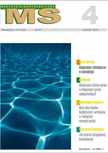 Skuteczność filtrów obrazu w diagnostyce guzów zębopochodnych omawia praca zamieszczona w dziale Aktualności Opinie. Ocena gęstości kości żuchwy i kręgosłupa kobiet z niedoborem estrogenów stosujących HTZ jest przedmiotem rozważań w dziale Stomatologia Praktyczna, Klinika. Dział Praktyka otwiera niezwykle pouczający mały atlas błędów technicznych i artefaktów w radiografii wewnątrzustnej. Kolejne prace poświęcono procedurom leczniczym u chorych ze złamaniami środkowego piętra części twarzowej czaszki, opisom przypadków nawracającej odmy ślinianek przyusznych i stłuczenia mięśnia skroniowego. Ocena zmian profilu struktur kostnych czaszki u pacjentów dorosłych leczonych ortodontycznie bez ekstrakcji zębów oraz ocena częstości występowania obrazu zwapnień w tętnicach szyjnych na zdjęciach pantomograficznych są przedmiotem prac pomieszczonych w dziale Badania. Zachęcam także do lektury stałych rubryk „Magazynu Stomatologicznego”.